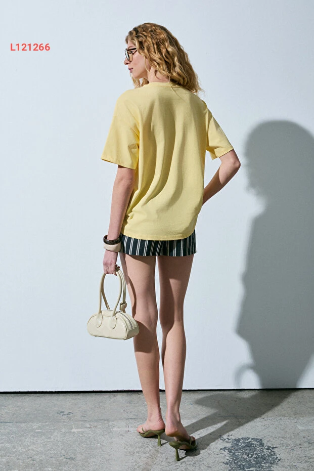 تيشيرت أصفر نسائي بأكمام قصيرة وبقصة واسعة من القطن العضوي مزخرف