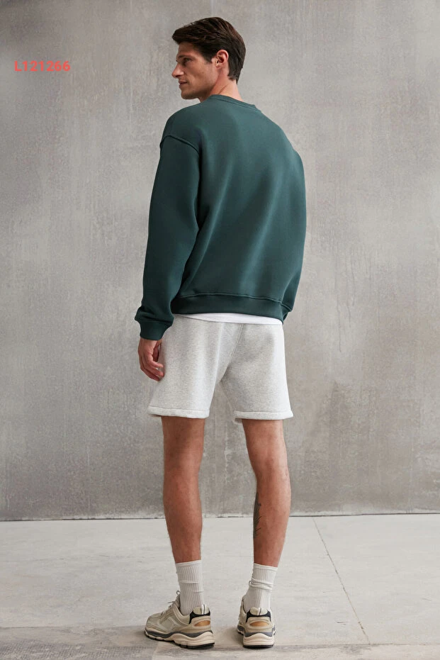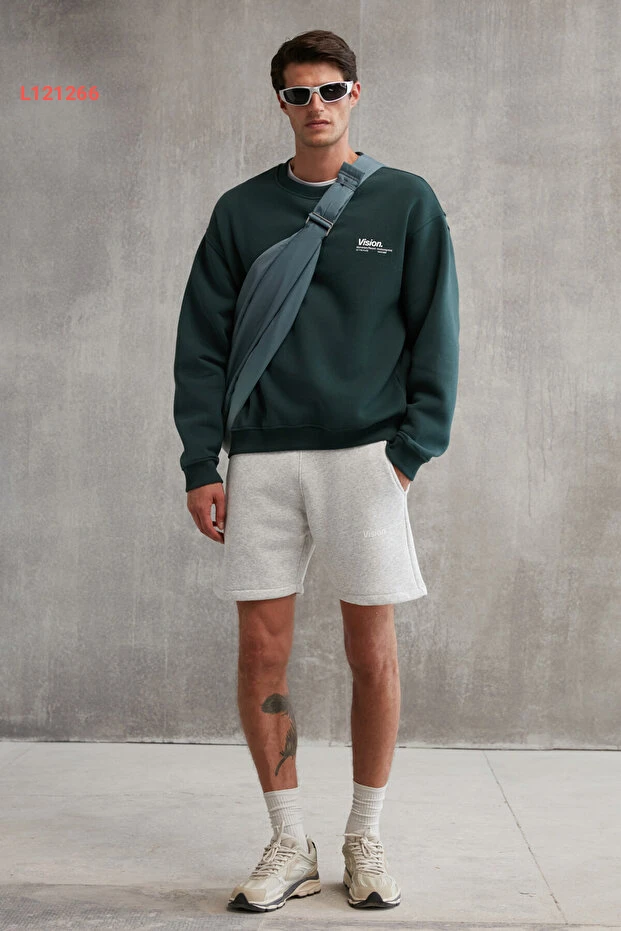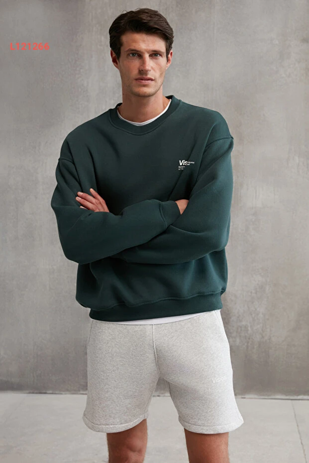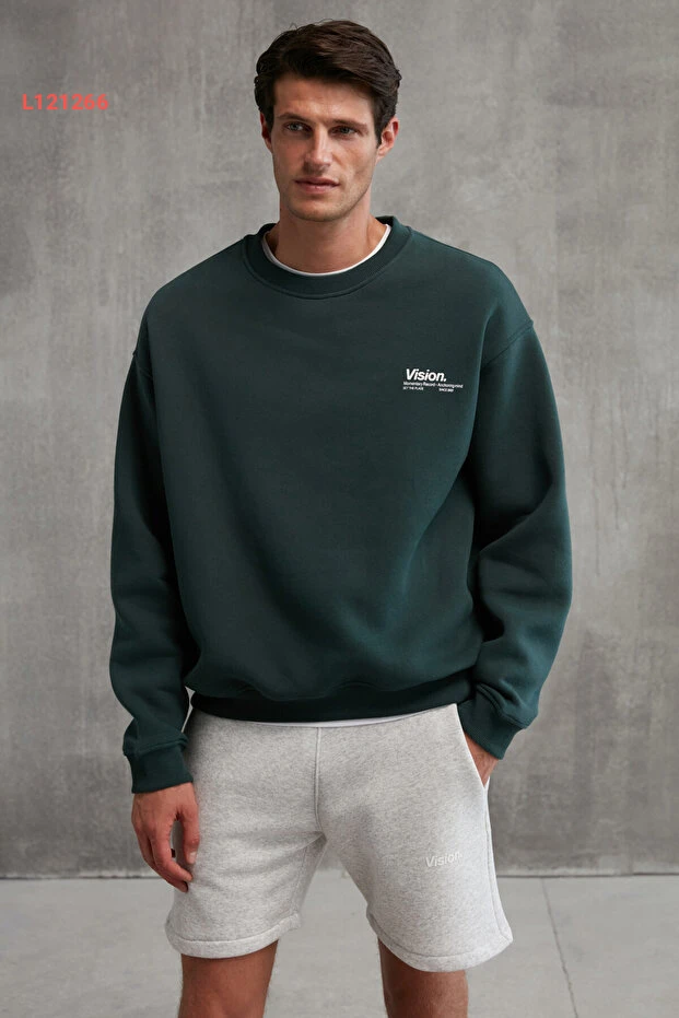 سويتشيرت شبه صوفية خضراء غامقة لرجال، لطيف وعصري من القطن العضوي بتفاصيل مطبوعة