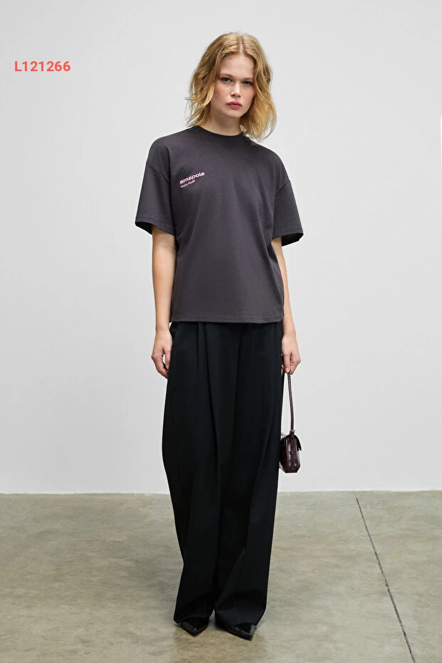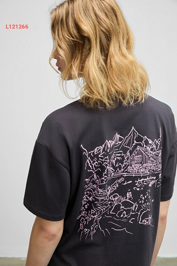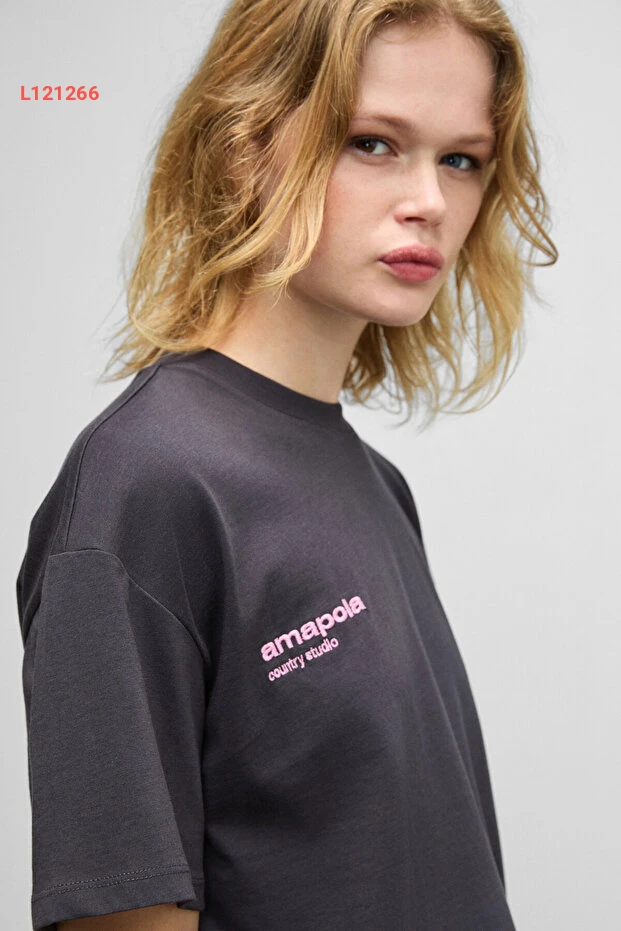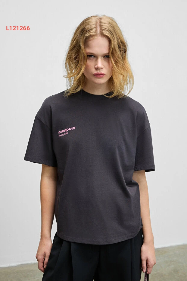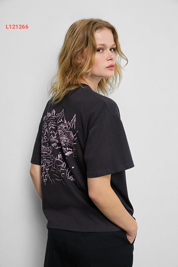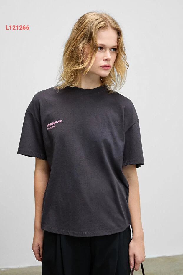 تيشيرت أنثراسايت بدار طباعة خلفية من قطن عضوي 100% بتصميم قصّة عادية من GRIMELANGE FINA للنساء