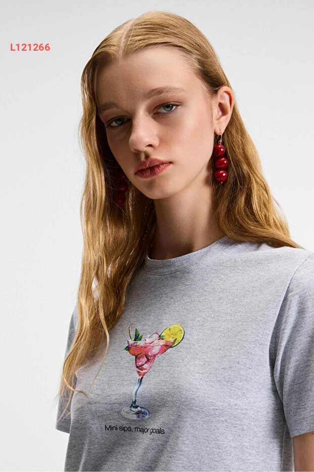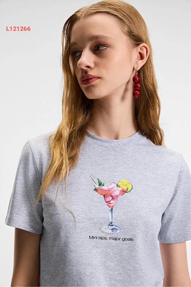 تي شيرت قميص قصير الأكمام مطبوع بتصميم كوكتيل من قطن عضوي للنساء - غريمالانج إيفون