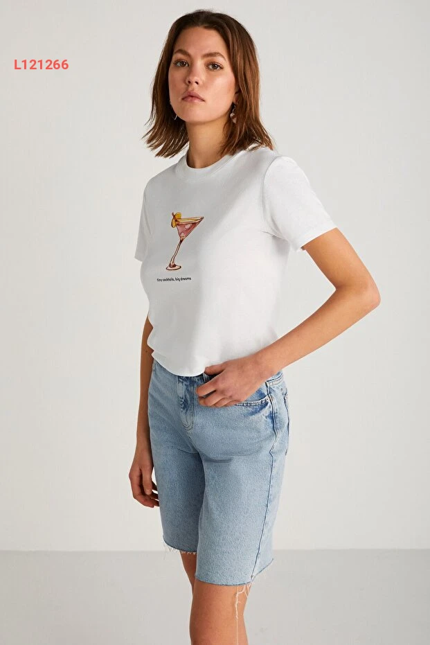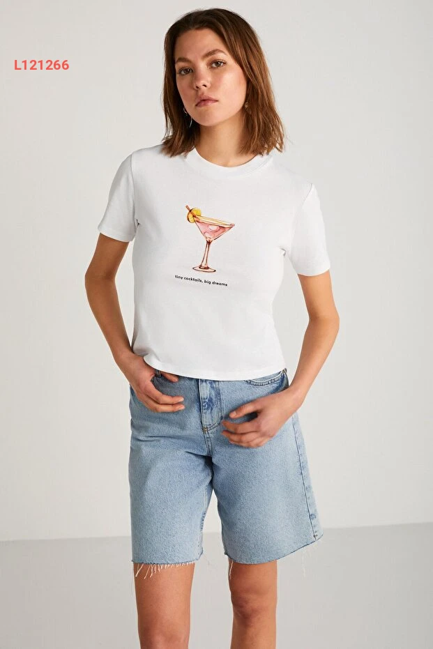 تي شيرت نسائي قصير الأكمام بتصميم طباعة عصري من قطن عضوي - أبيض