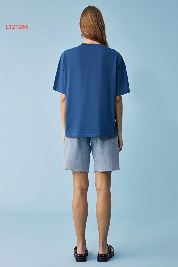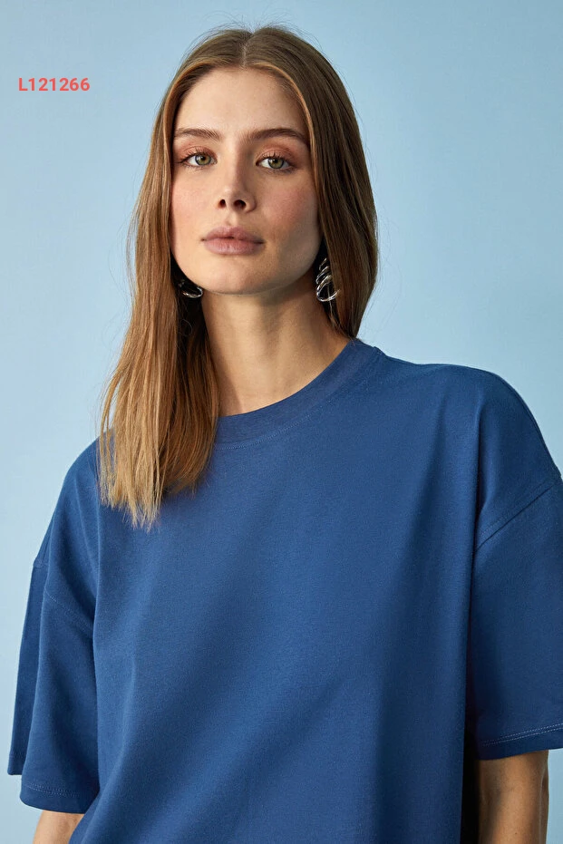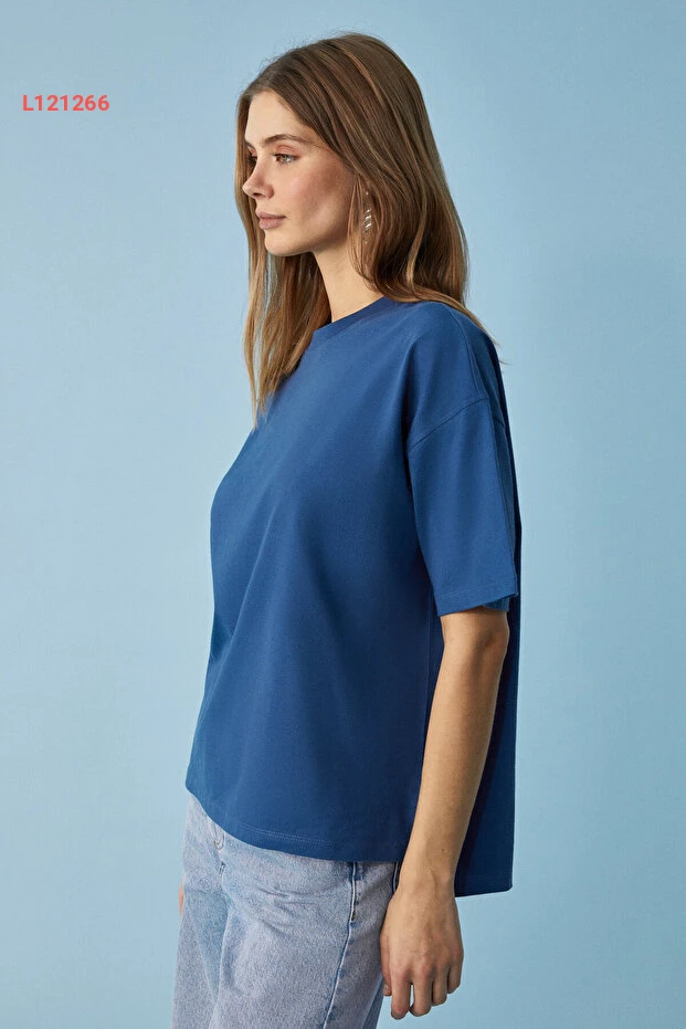 تي شيرت نسائي لاركسد فيت من قطن عضوي 100% مع فتحة جانبية بياقة دائرية باللون الأزرق الداكن
