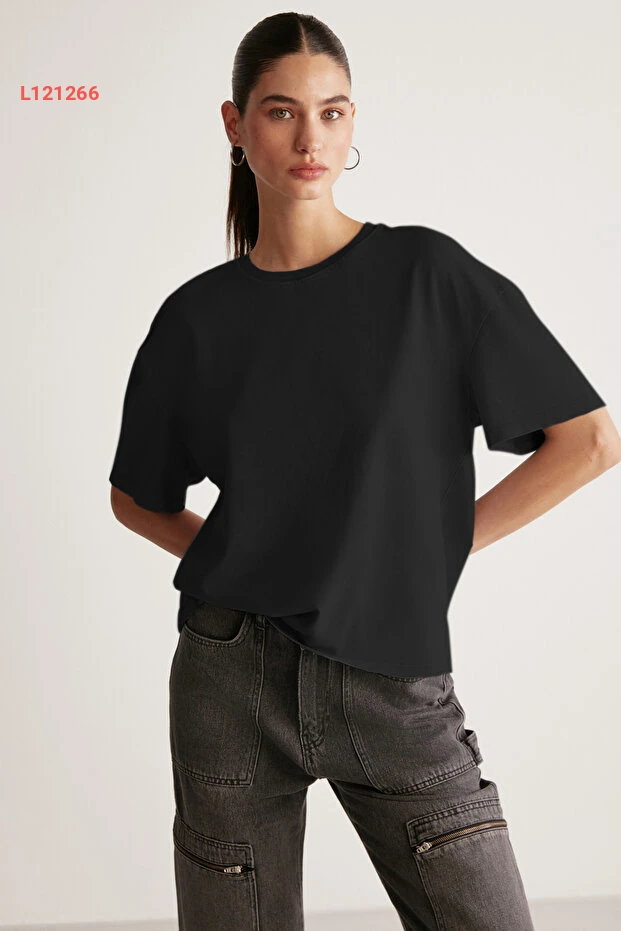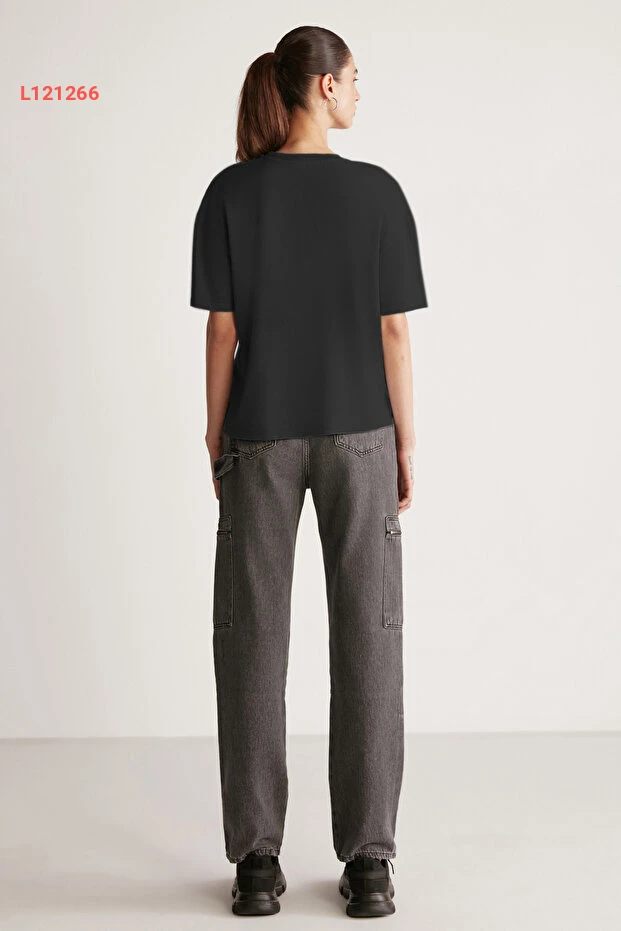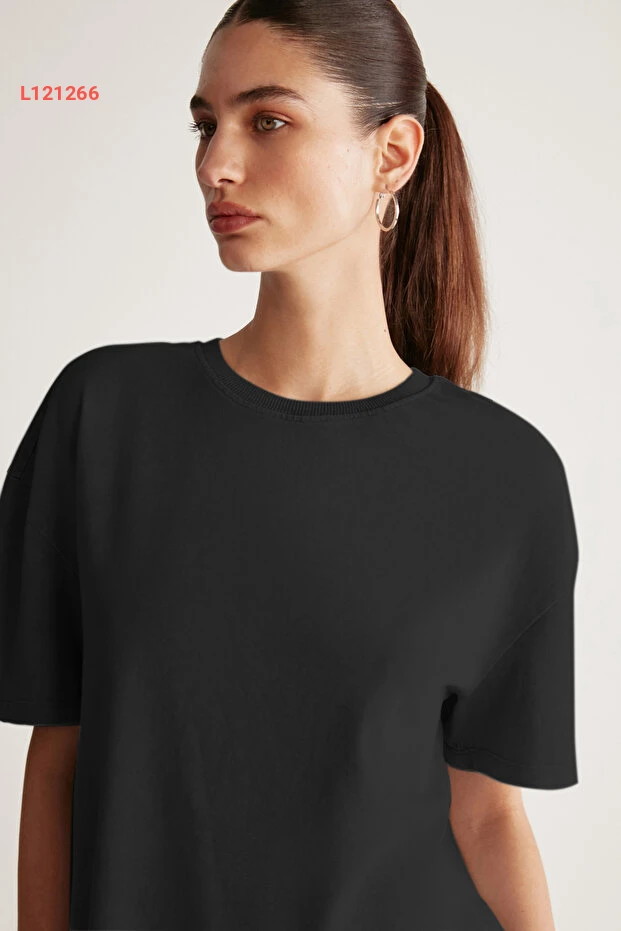 تيشيرت نسائي أسود بفتحة دائرية من القطن العضوي بنسبة 100% بتصميم مريح من غريميلانج