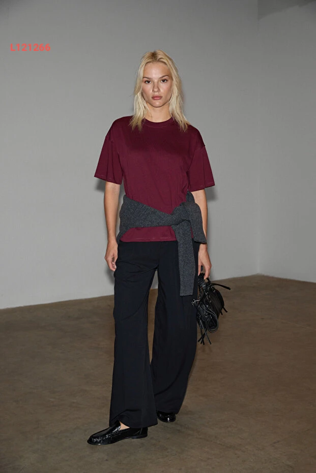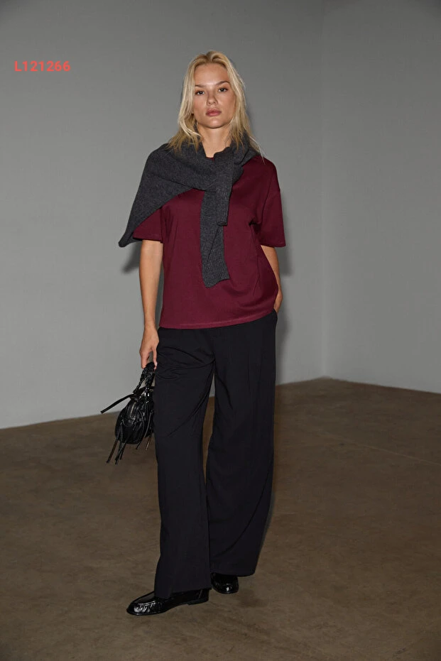 تي شيرت بوردو نسائي بقصة مريحة من 100% قطن عضوي مع فتحات جانبية