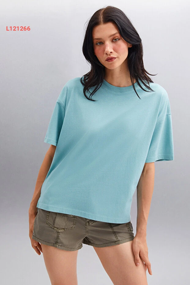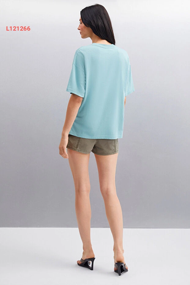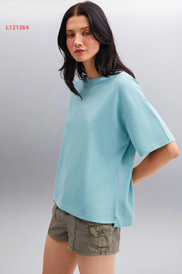 تي شيرت نسائي من غريميلانج 100% قطن عضوي بقصة مريحة مع شقوق، لون أخضر، ياقه مدورة