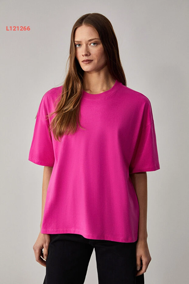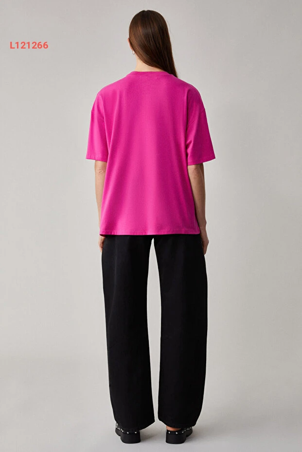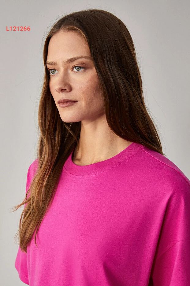 تيشيرت نسائي وردي بتصميم مريح من 100% قطن عضوي مع شقوق وفتحة دائرية