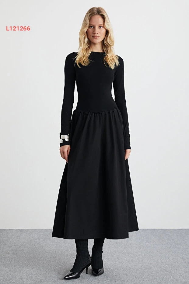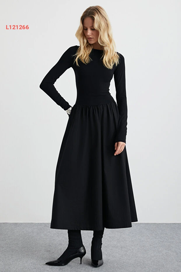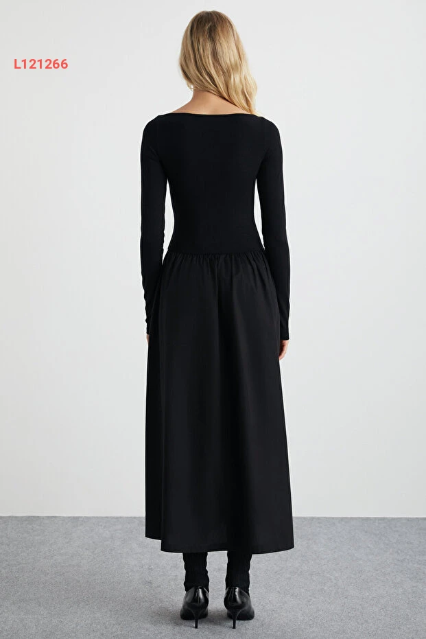 فستان أسود أنيق مزين بطول ماكسي من قماش بوبلين مع الجزء العلوي المرن من فيسكوز وإيلاستين