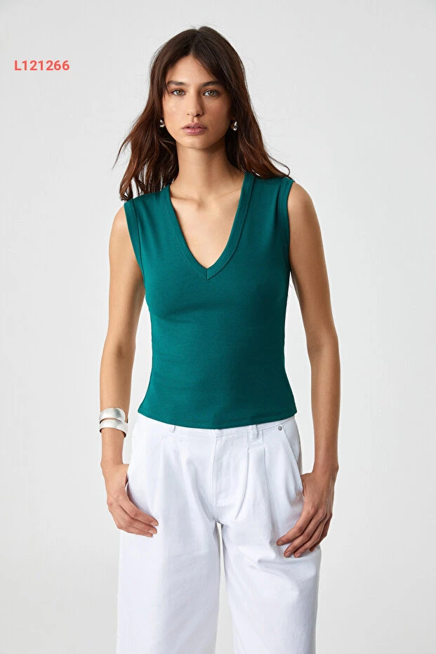 بلوزة نسائية سليم ذات ياقة على شكل V بدون أكمام باللون الأخضر الداكن من جريملانج