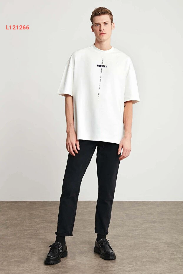 تي شيرت أبيض بأكمام واسعة ومطبوعات تفصيلية من القطن العضوي 100% للرجال من جريمالانج