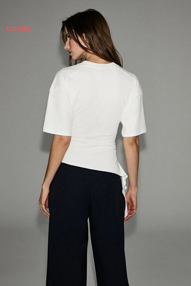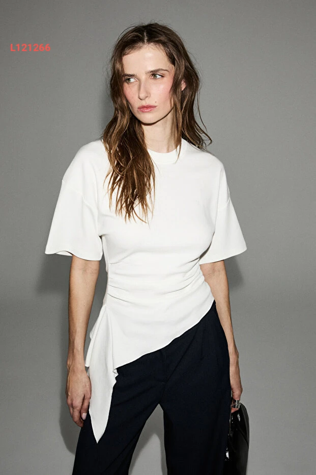 بلوزة بيضاء نسائية بياقة مدورة وقصّة غير متساوية من قماش ناعم من غريميلانج سويرف
