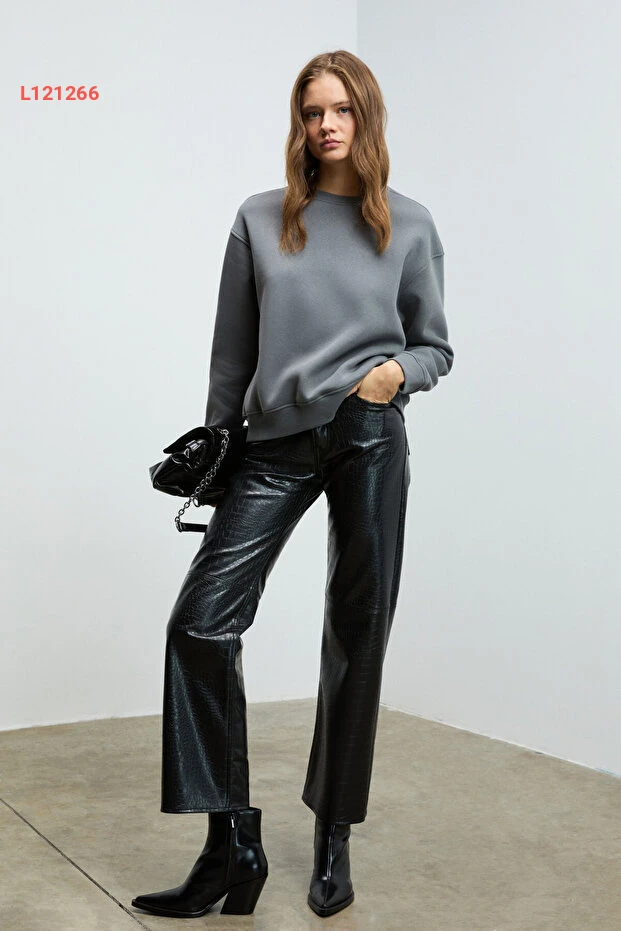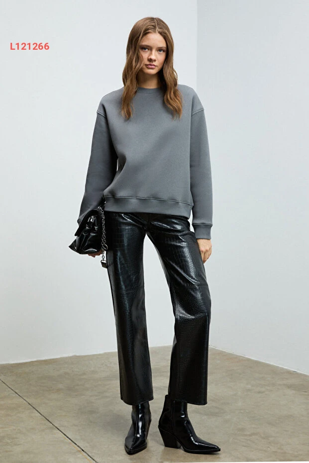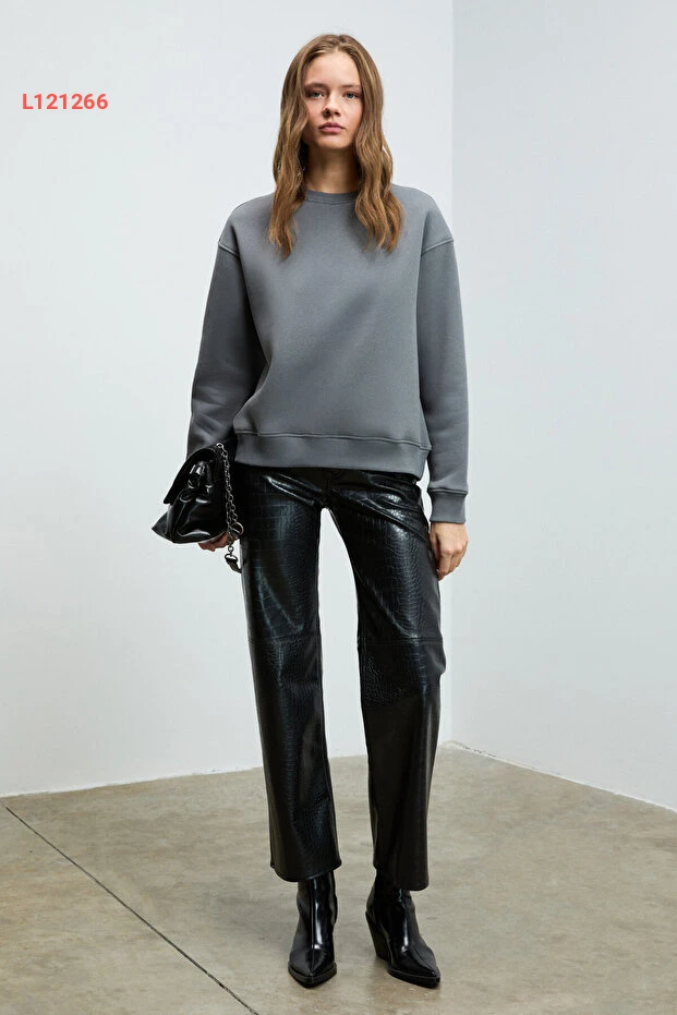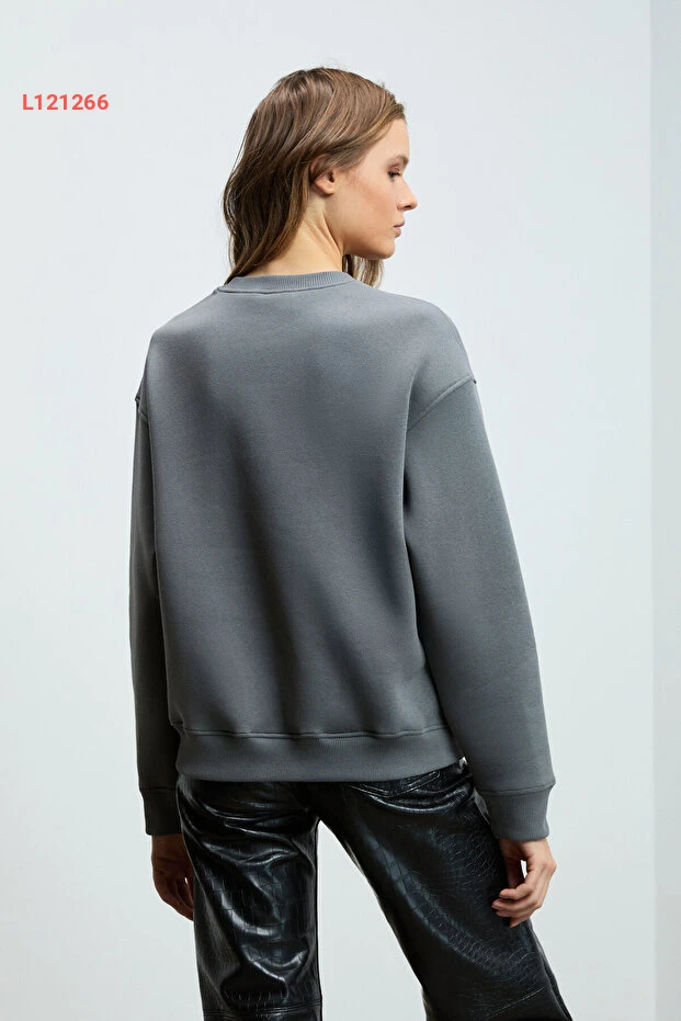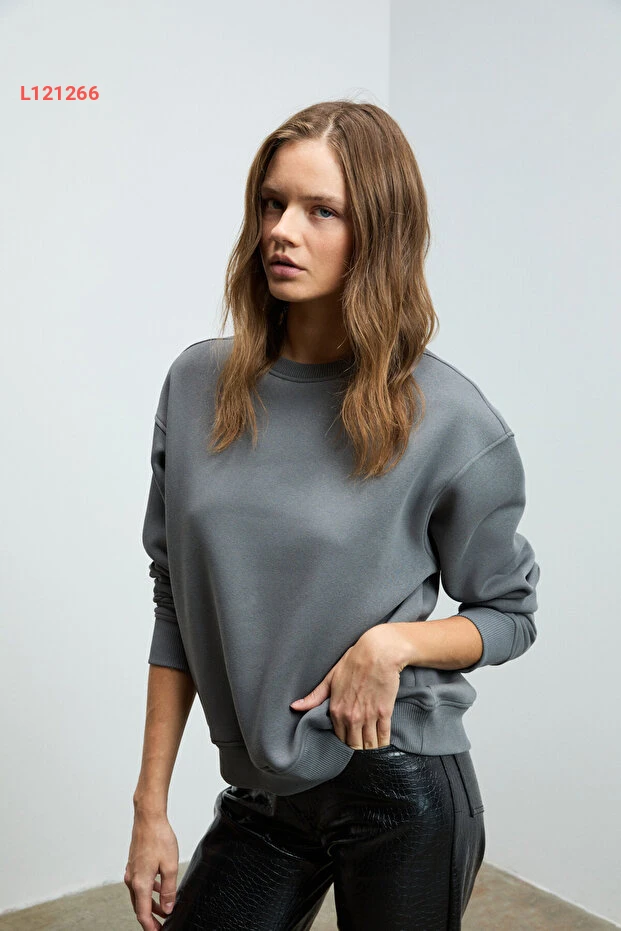 سويت شيرت نسائي رمادي من القطنيات العضوية الناعمة مع بطانة بولارية برقبة دائرية