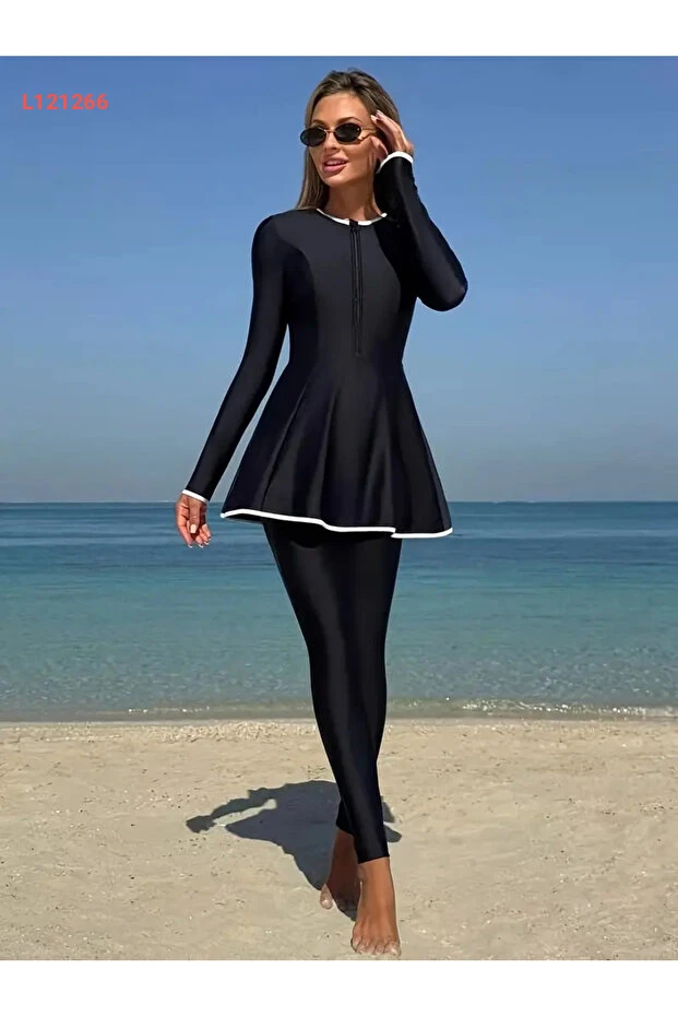 مايوه تسبيح قطر واسط مع طاقية - أسود أبيض بتفاصيل حواف
