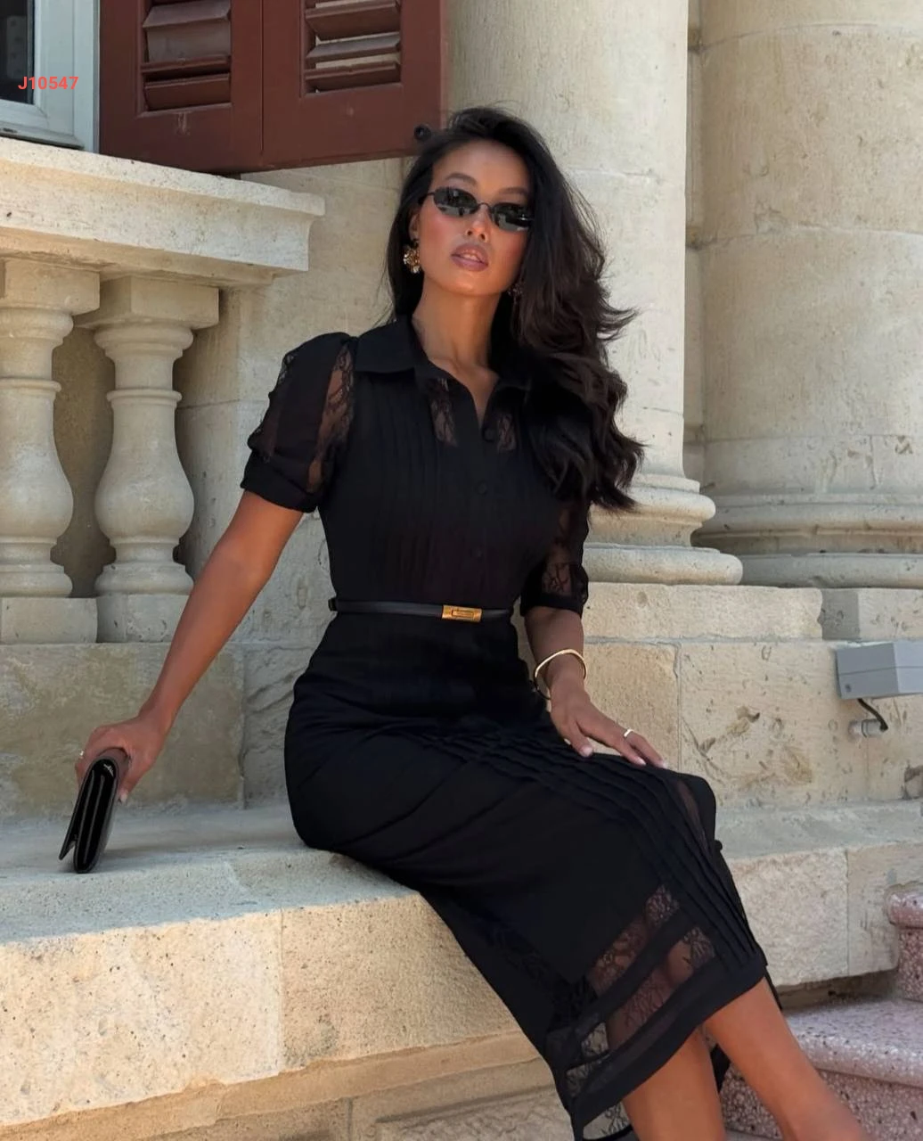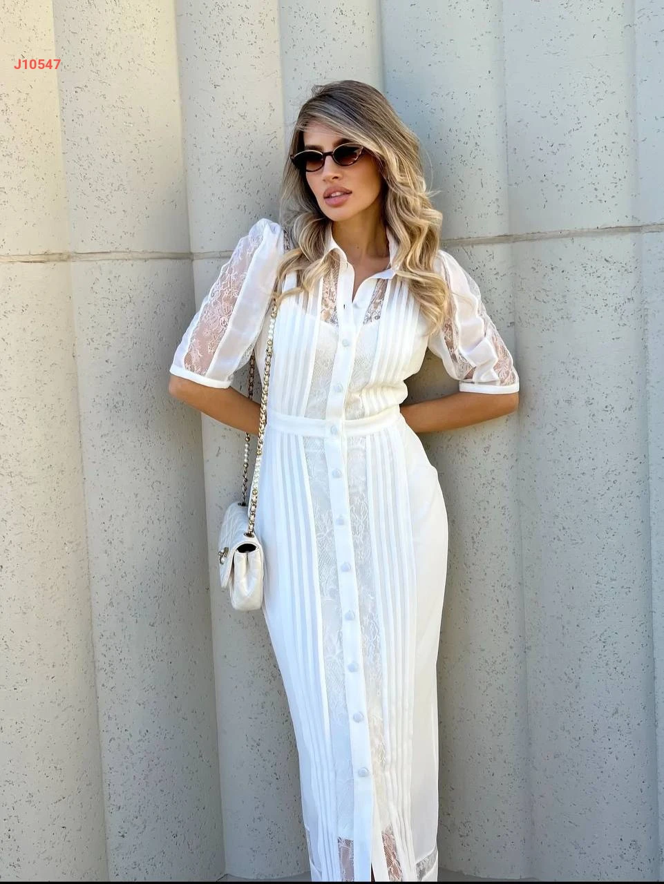 فستان نصف كم بتفاصيل دانتيل وأزرار