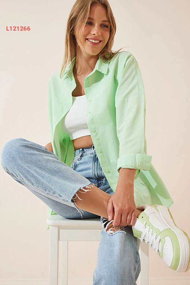قميص أساسي طويل نسائي بلمسة عصرية باللون الأخضر الفاتح من هابنس إسطنبول