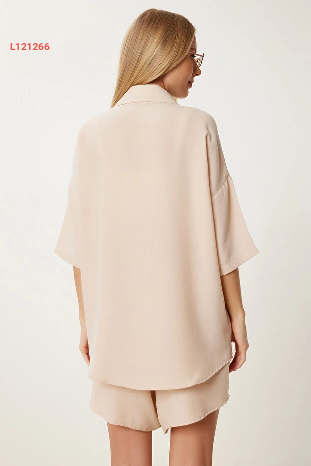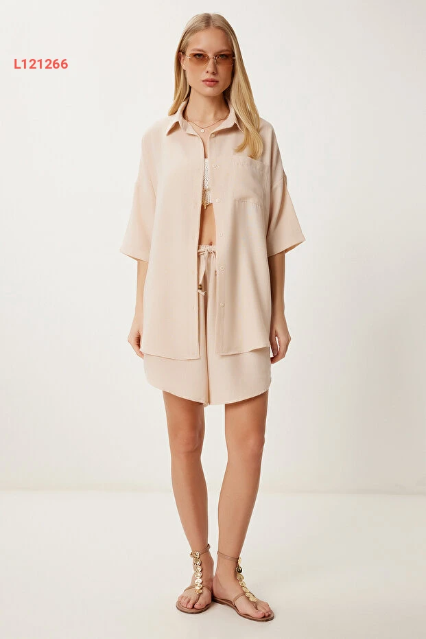 طقم شورت وقميص كتان نسائي بيسج من هابينس إسطنبول DZ00124