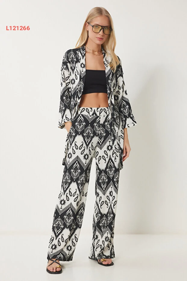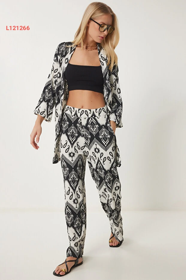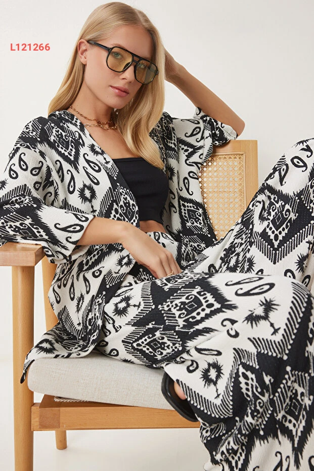 مجموعة كيمونو وبنطال نسائية مزخرفة بالأبيض والأسود من هابنس إسطنبول