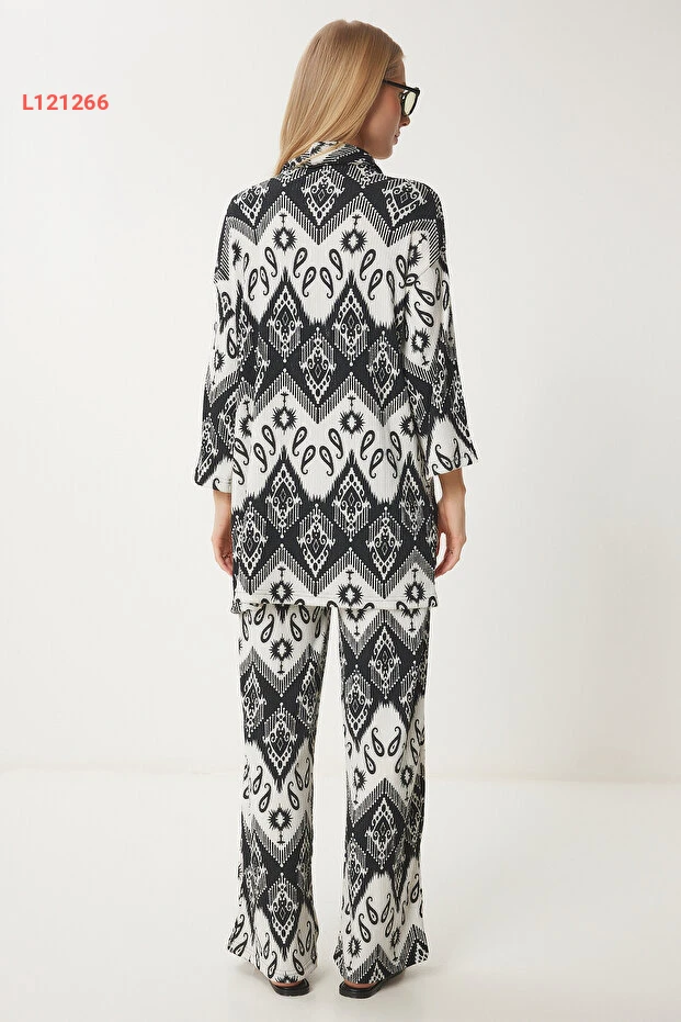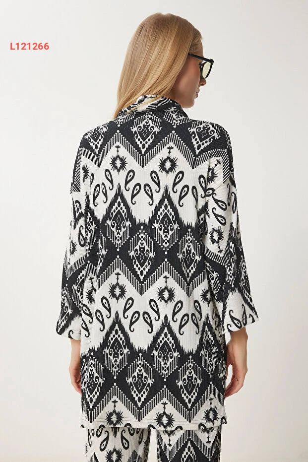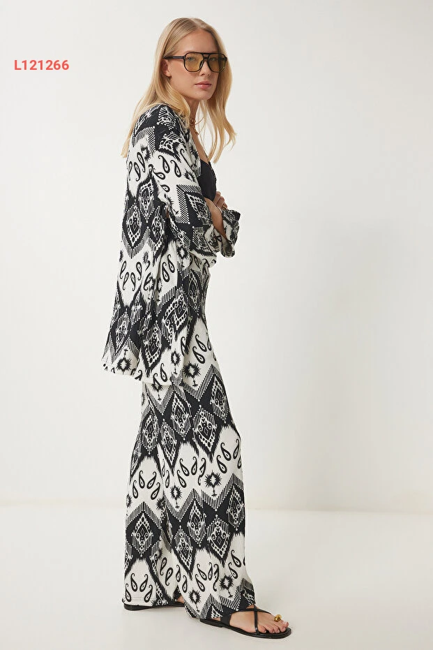 استمتعي بإطلالة عصرية ومريحة مع طقم الكيمونو والبنطلون من Happiness İstanbul. بتصميمه الأسود والأبيض المزخرف، يضمن لك هذا الطقم الأنيق الجمع بين الأناقة والراحة في أيام الصيف. مصنوع من خامة خفيفة، مثالي للتنقل خلال اليوم أو الاسترخاء في الأمسيات.