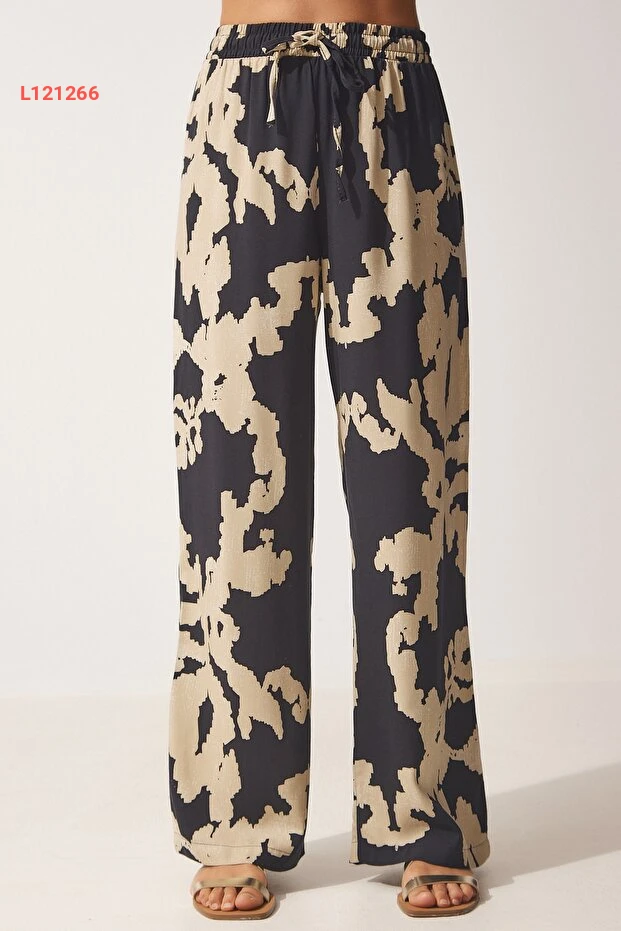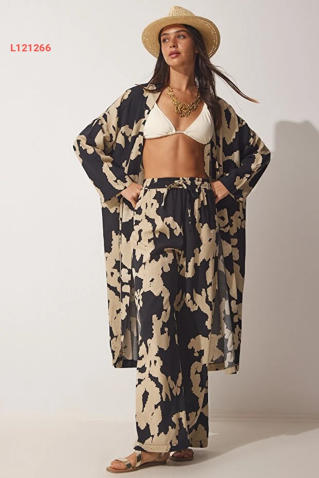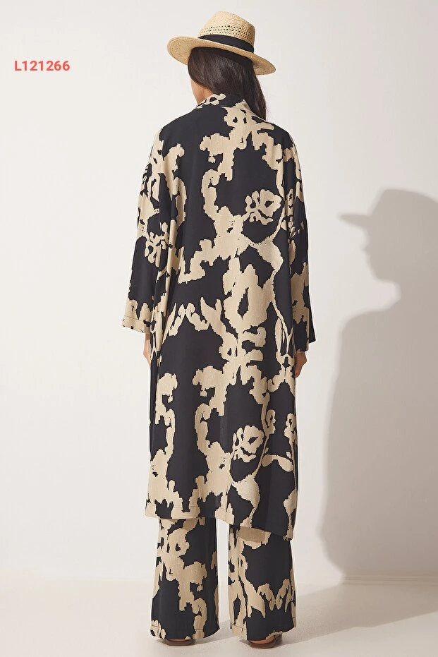 طقم كيمونو وبنطلون بالازو من Happiness İstanbul للنساء - أسود مع نقوش بيج