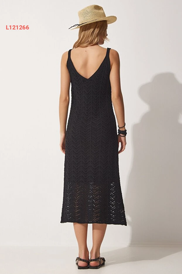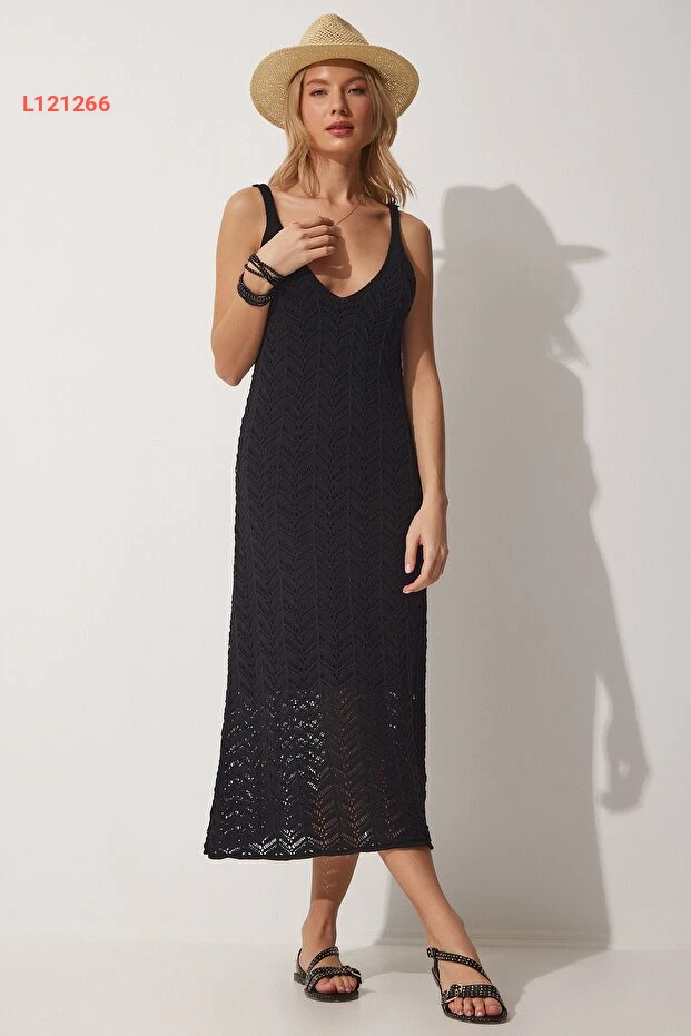فستان تريكو صيفي أسود بحمالات نسائي مزخرف من هابنس اسطنبول NF00044
