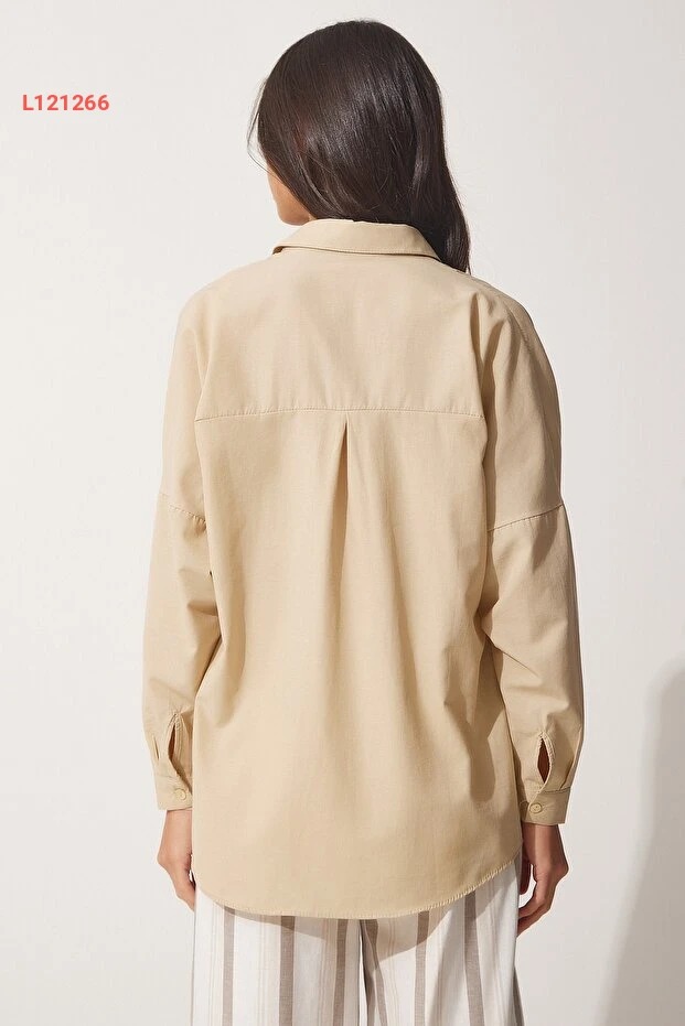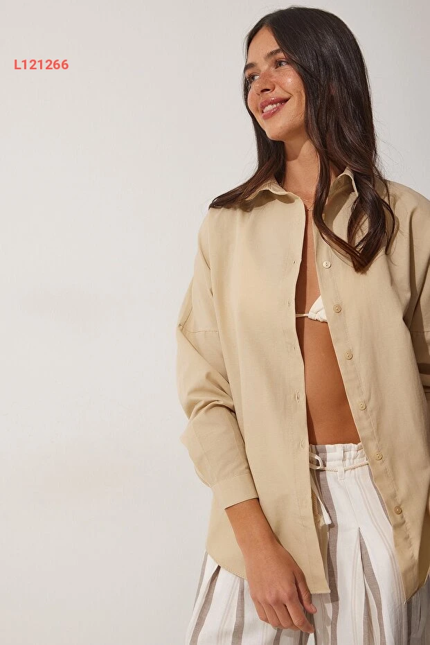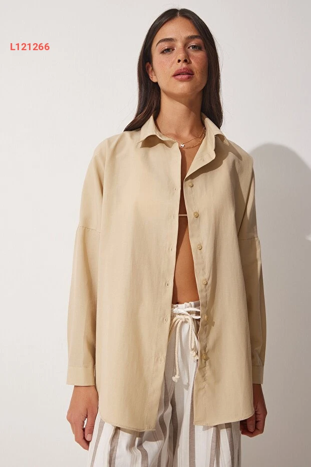 قميص أساسي طويل فضفاض بلون الكريمي الداكن للنساء من هابينس إسطنبول DD00842