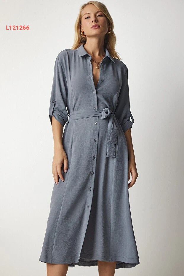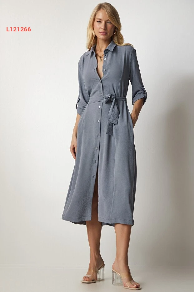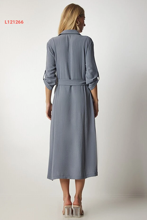 فستان قميص نسائي رمادي بحزام من هابينس إسطنبول DD01256