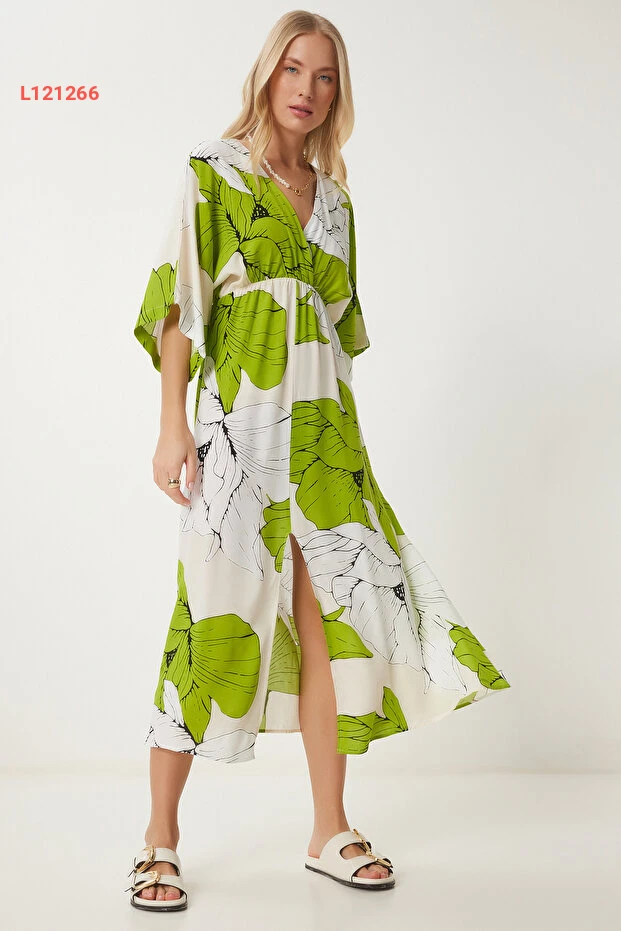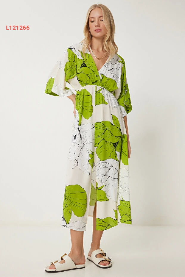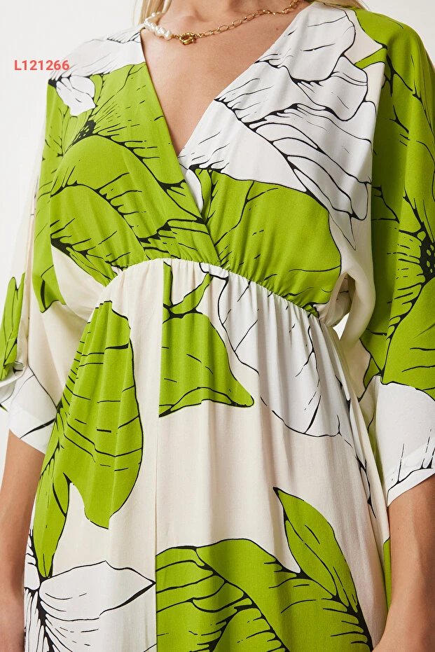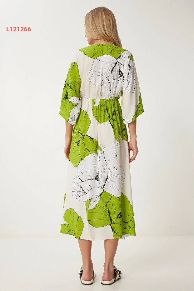 فستان صيفي مزخرف بألوان الأخضر والأبيض من هابي ناس اسطنبول ذو ياقة أنفصالية DK00166