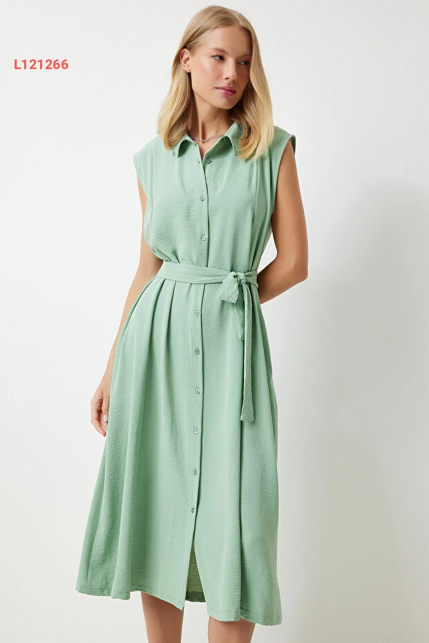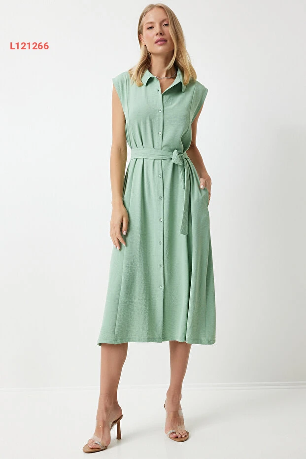 فستان صيفي نسائي كتان فسكوز بلون أخضر فاتح من هابي نساسطنبول