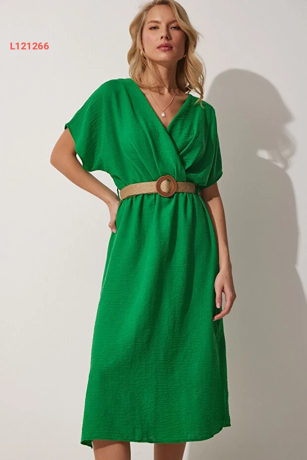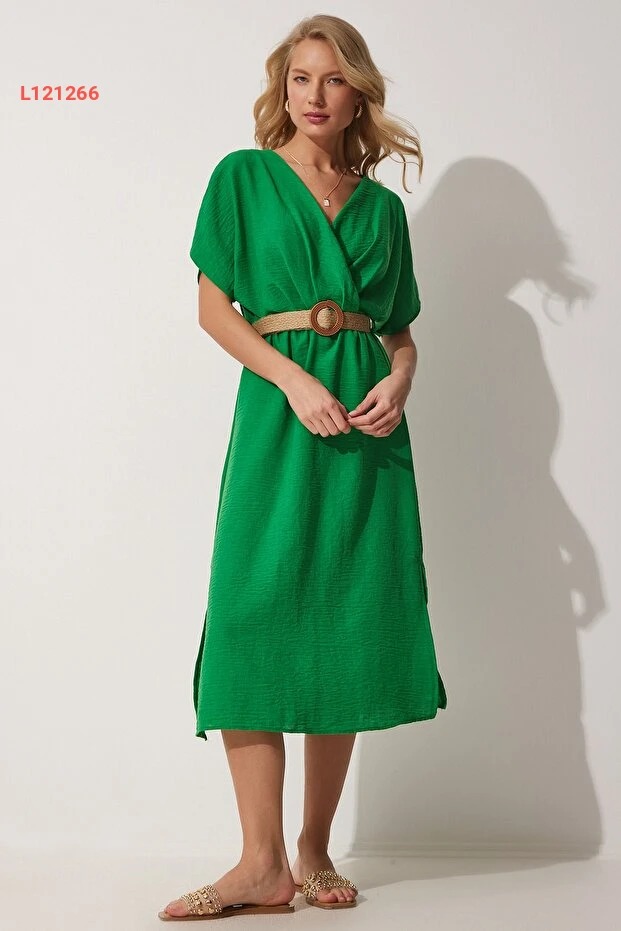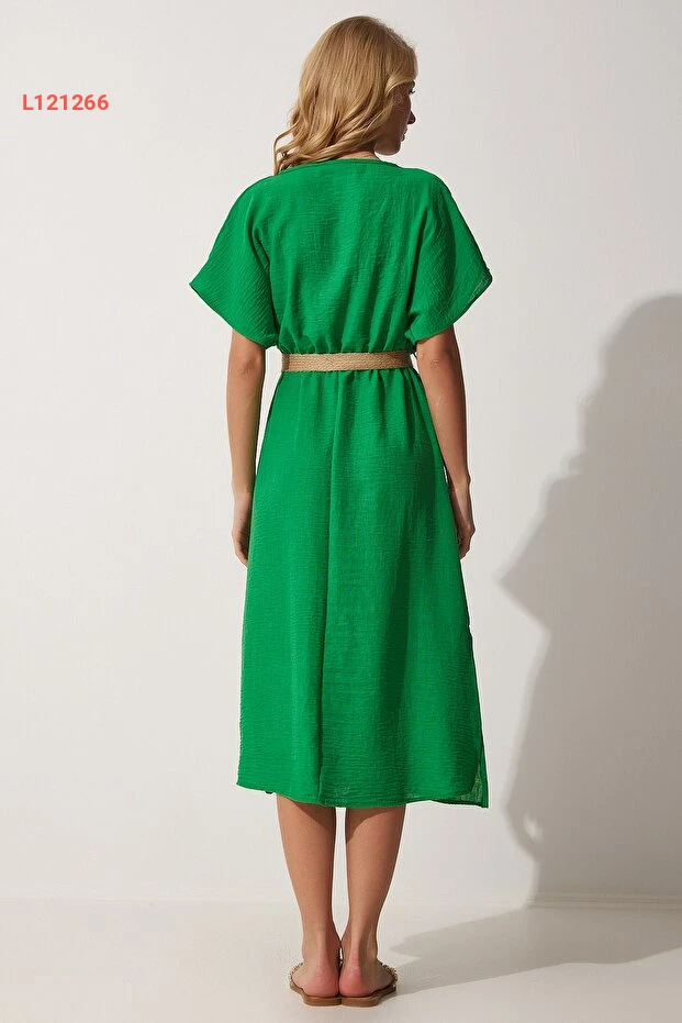 فستان صيفي أخضر زاهي بحزام من قماش الآيروبين من هابي نساء إسطنبول ZH00022