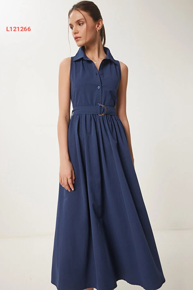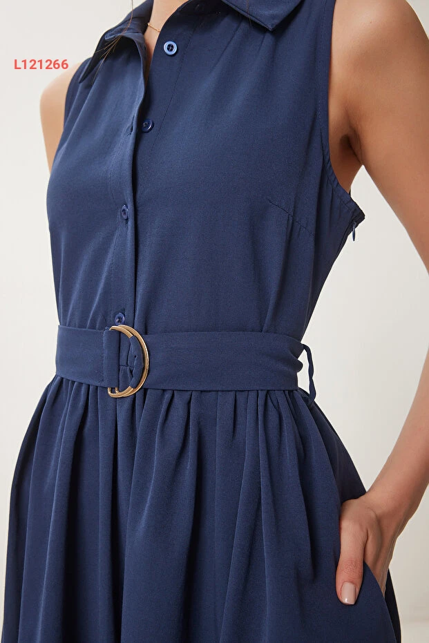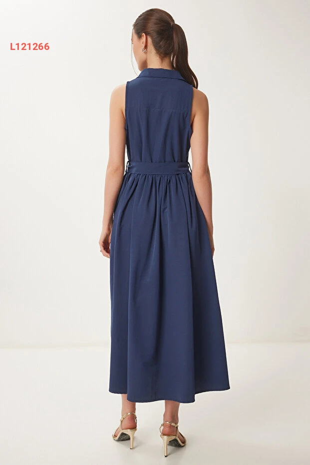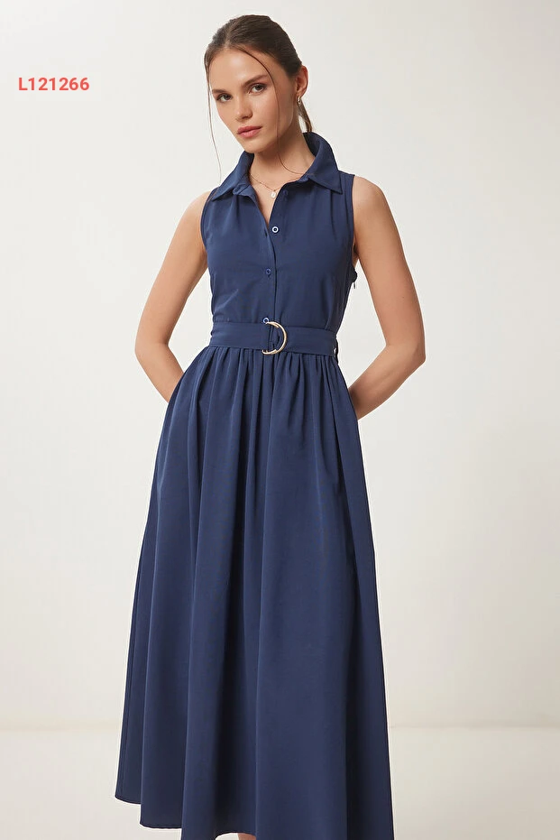 فستان قميص ميدي كحلي مزود بحزام من هابي نساء إسطنبول