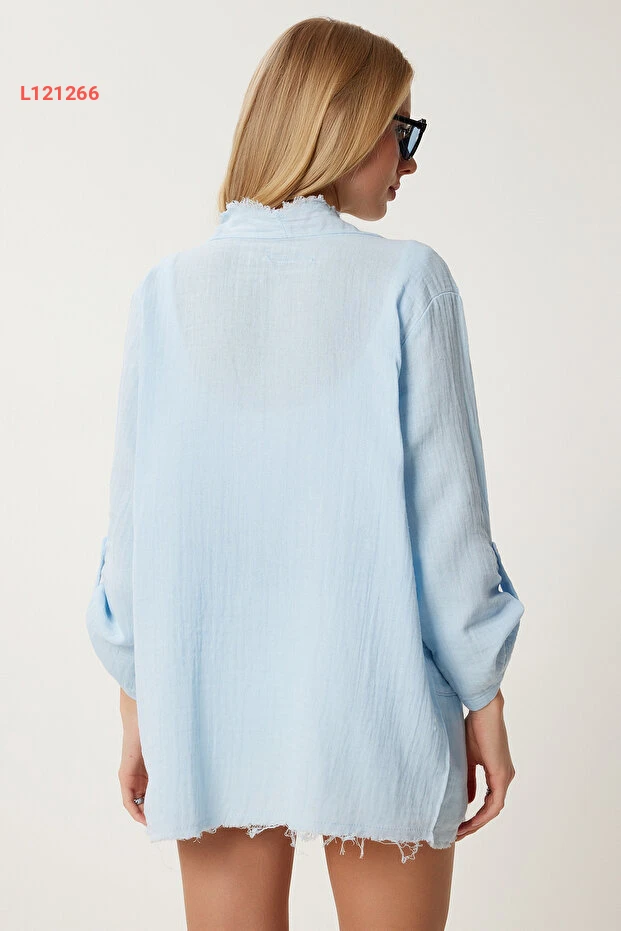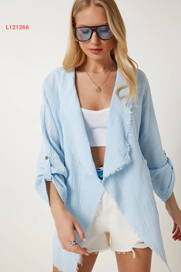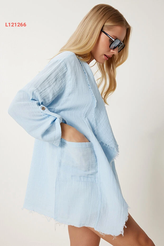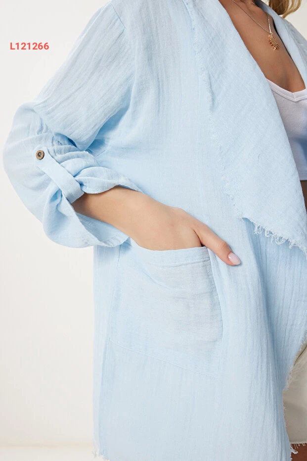 استمتعي بأناقة لا مثيل لها مع جاكيت "Happiness İstanbul" باللون الأزرق السماوي، الذي يجمع بين الراحة والعصرية. مصنوع من قماش الموسلين الخفيف، يتميز بأطرافه المتفرعة التي تضفي لمسة من الحيوية على إطلالتك، مما يجعله الخيار المثالي لتكملتي مظهرك في أي مناسبة. تألقي بثقة مع تصميم يجسد الأناقة العصرية!