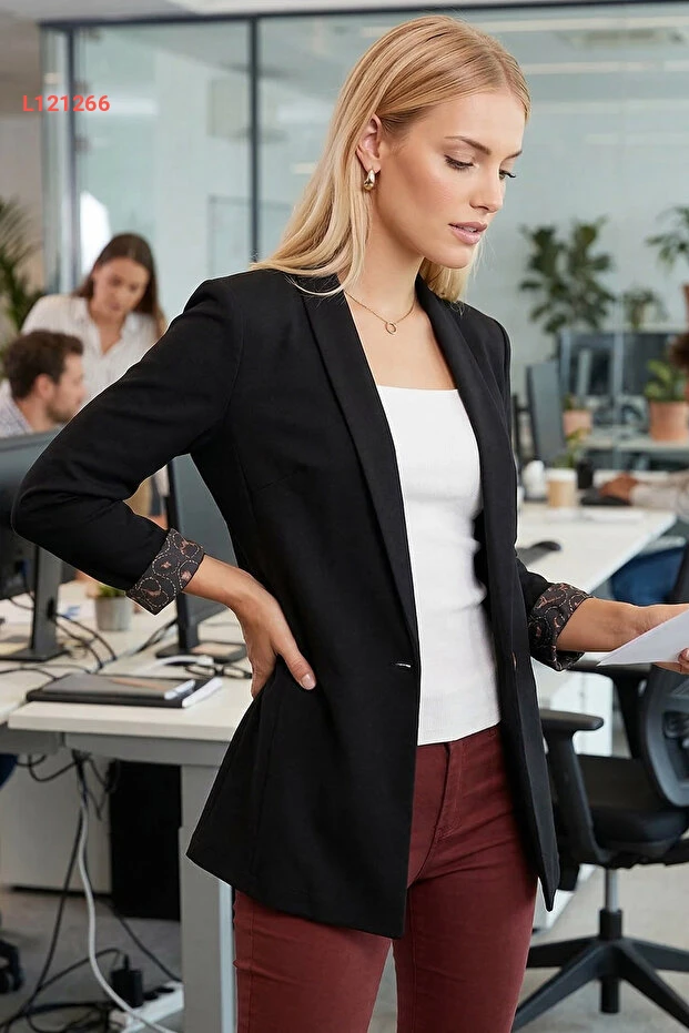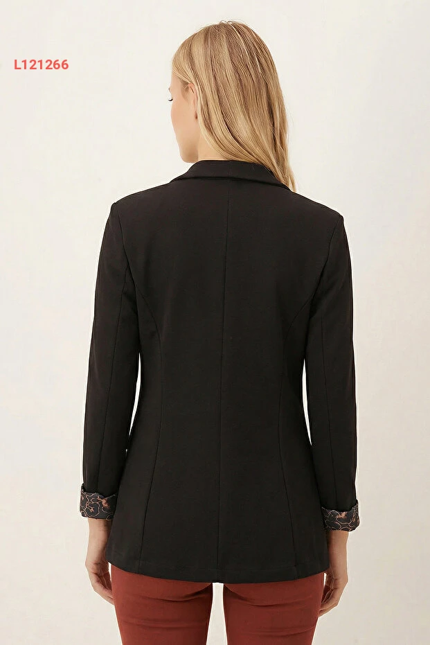 جاكيت نسائي أسود بأكمام مزينة بياقة شال وزر واحد