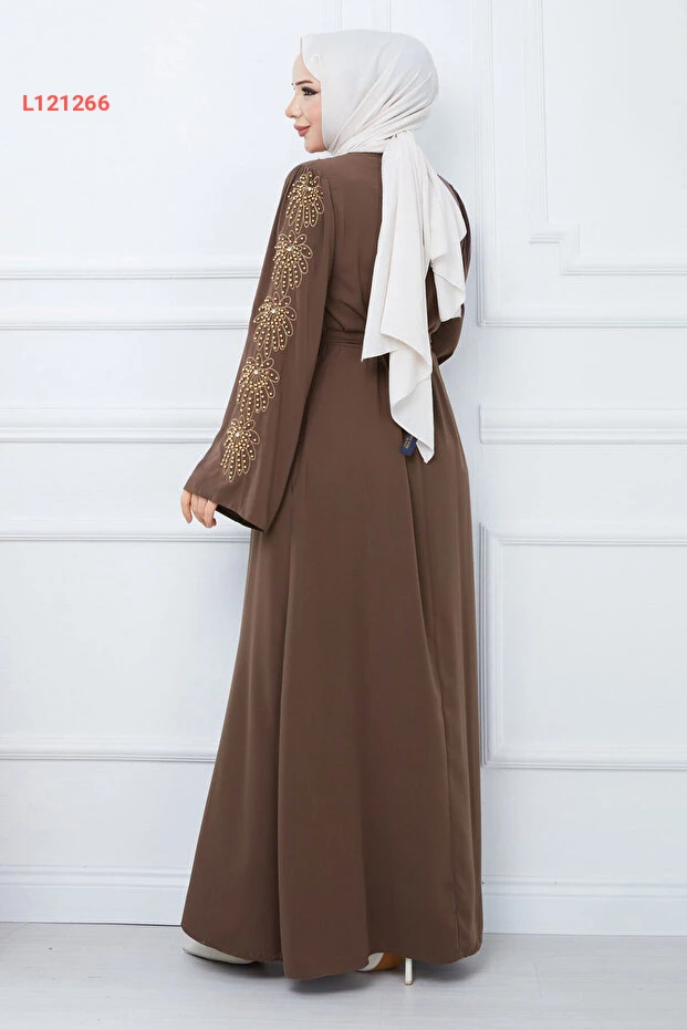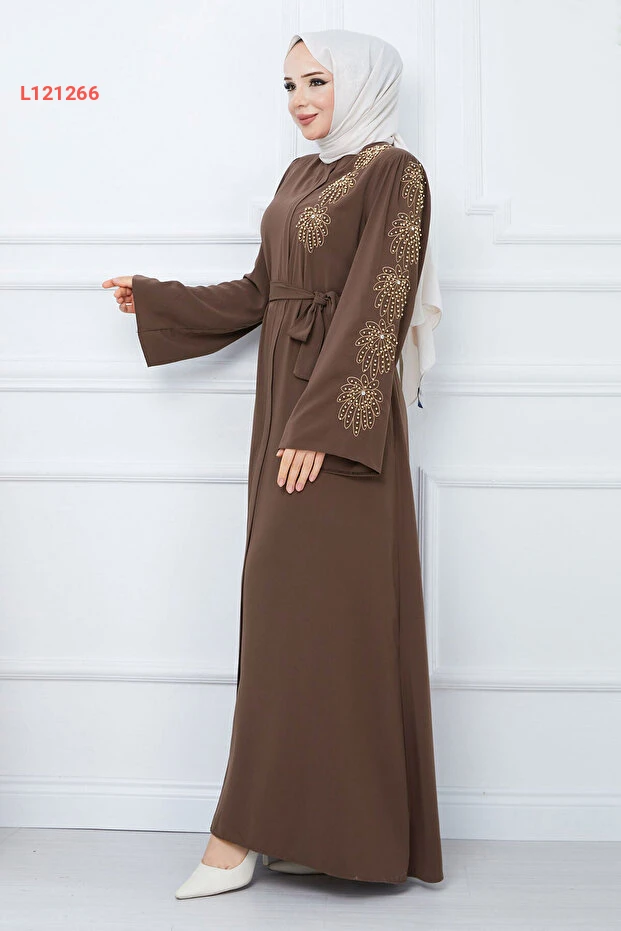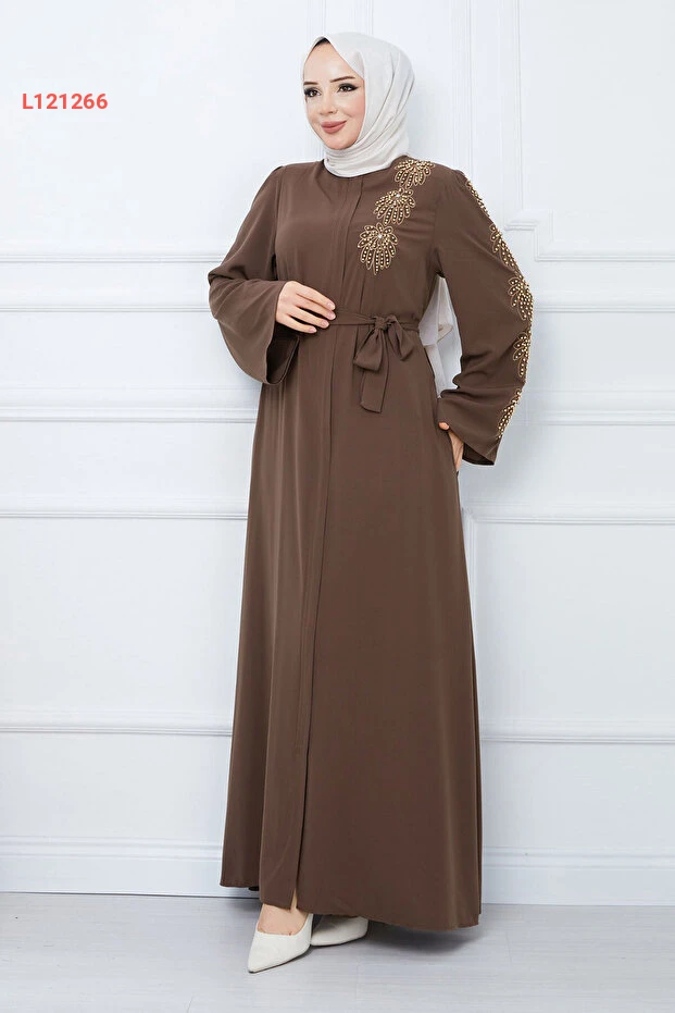 عباءة تسيتور مزينة بخيوط لؤلؤة مع حزام - بني