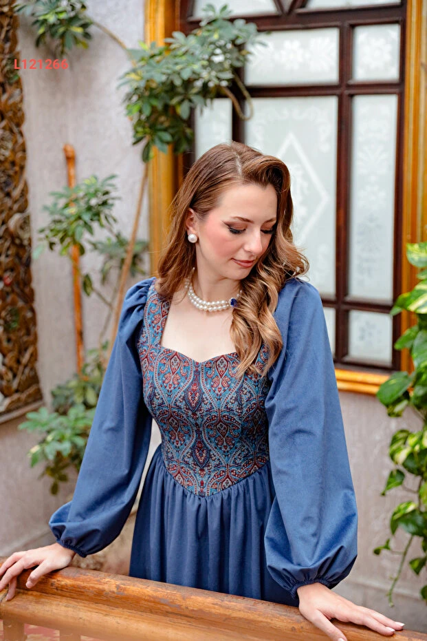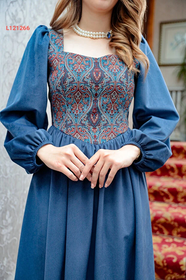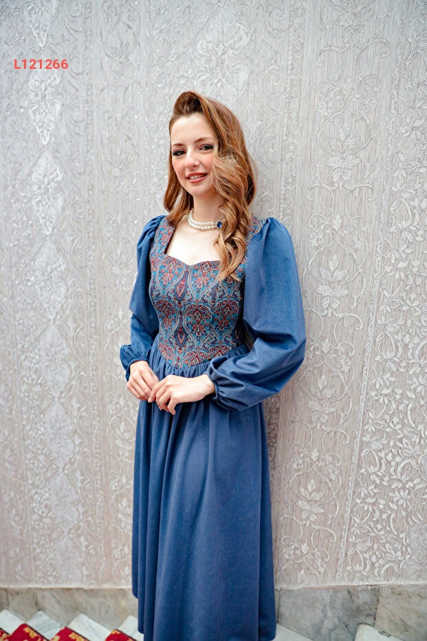 فستان ميمونيك مزين بنقوش إثنية من المخمل الأزرق الناعم