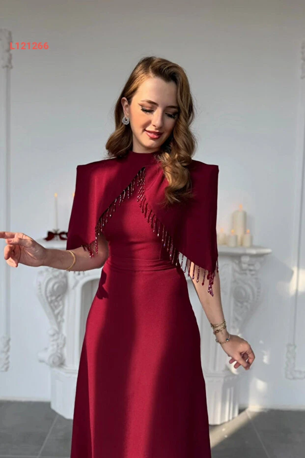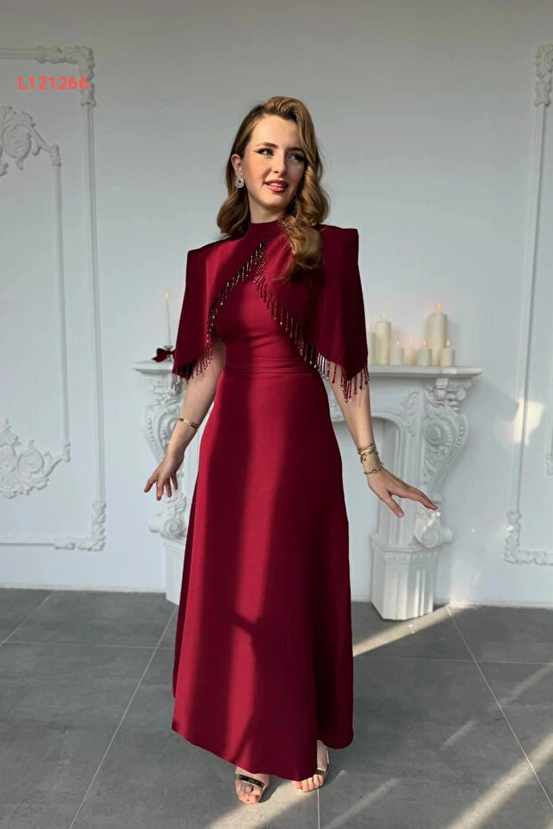 HELİS BUTİK Özel Tasarım Taş İşleme Detaylı Bordo Abiye Elbise