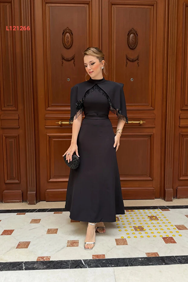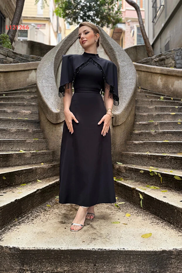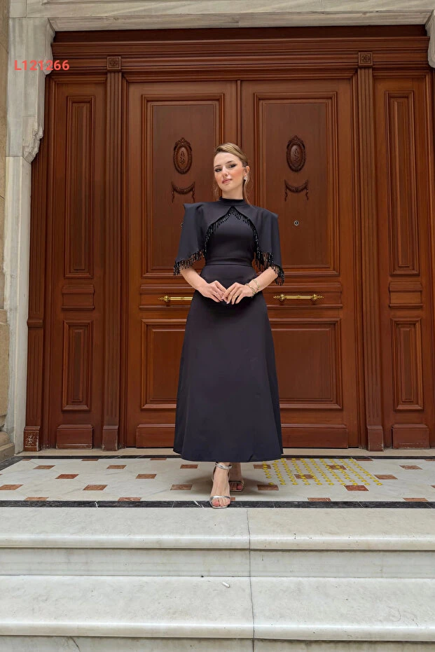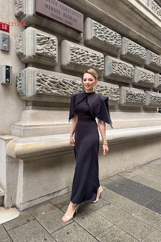 HELİS BUTİK Özel Tasarım Taş İşleme Detaylı Siyah Abiye Elbise