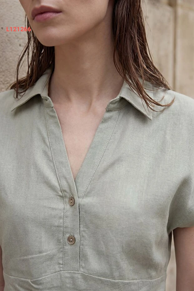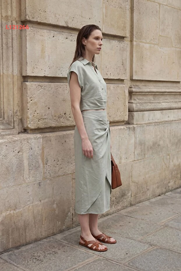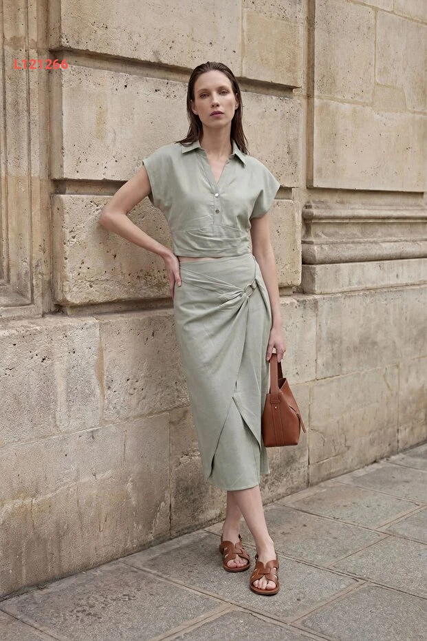 مجموعة قميص بولو عالية الخصر من الكتان مكونة من قطعتين