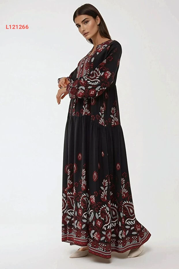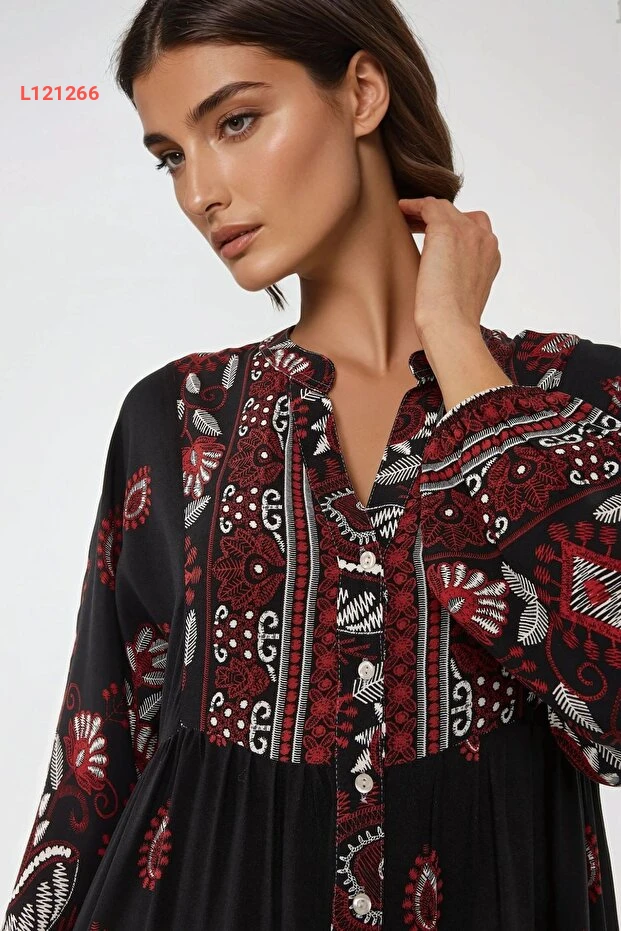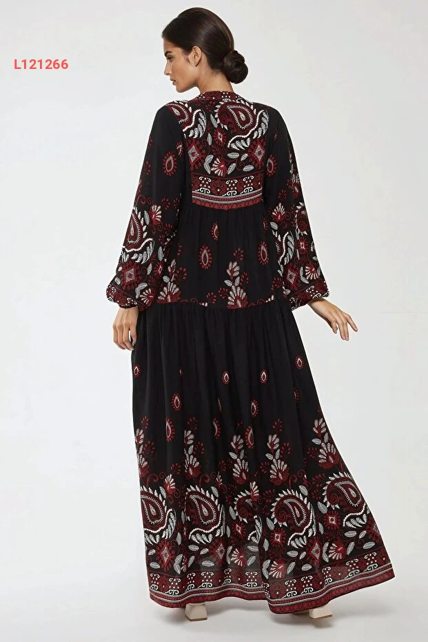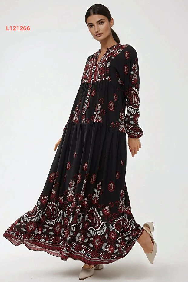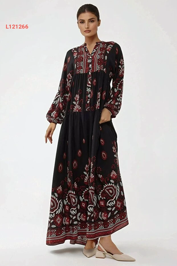 استمتع بأناقة بسيطة مع فستان Hiccup المطبوع بأكمام طويلة، المصنوع من قماش الفيسكوز الفاخر الذي يوفر لك الراحة والنعومة. يضفي التصميم المحتشم لمسة من الأناقة الكلاسيكية، مما يجعله الخيار المثالي لجميع المناسبات. ارتديه مع إكسسوارات أنيقة لتجديد إطلالتك بكل سهولة!