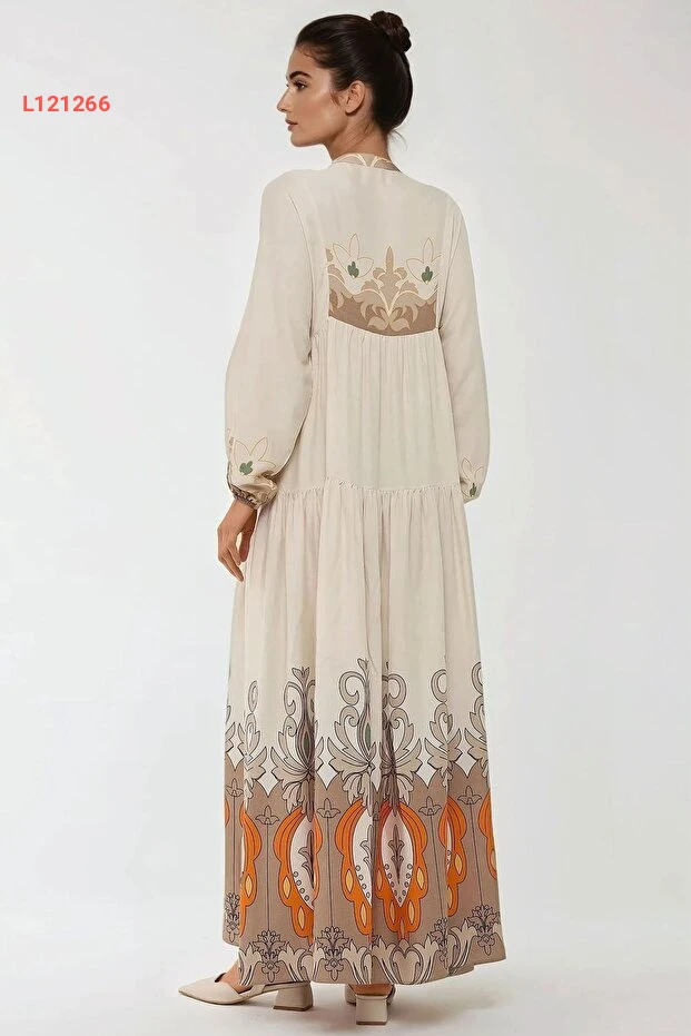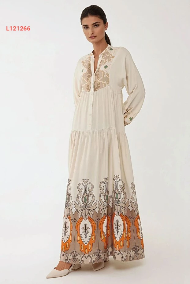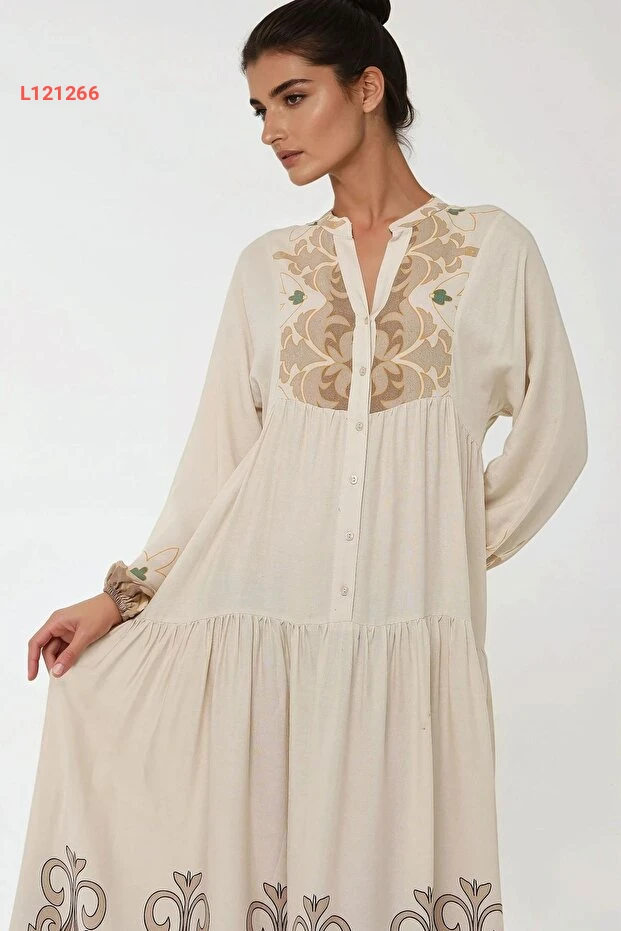 فستان مودست طويل الأكمام مزخرف بتصميم هيكاب
