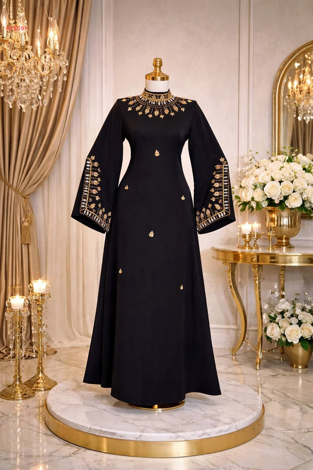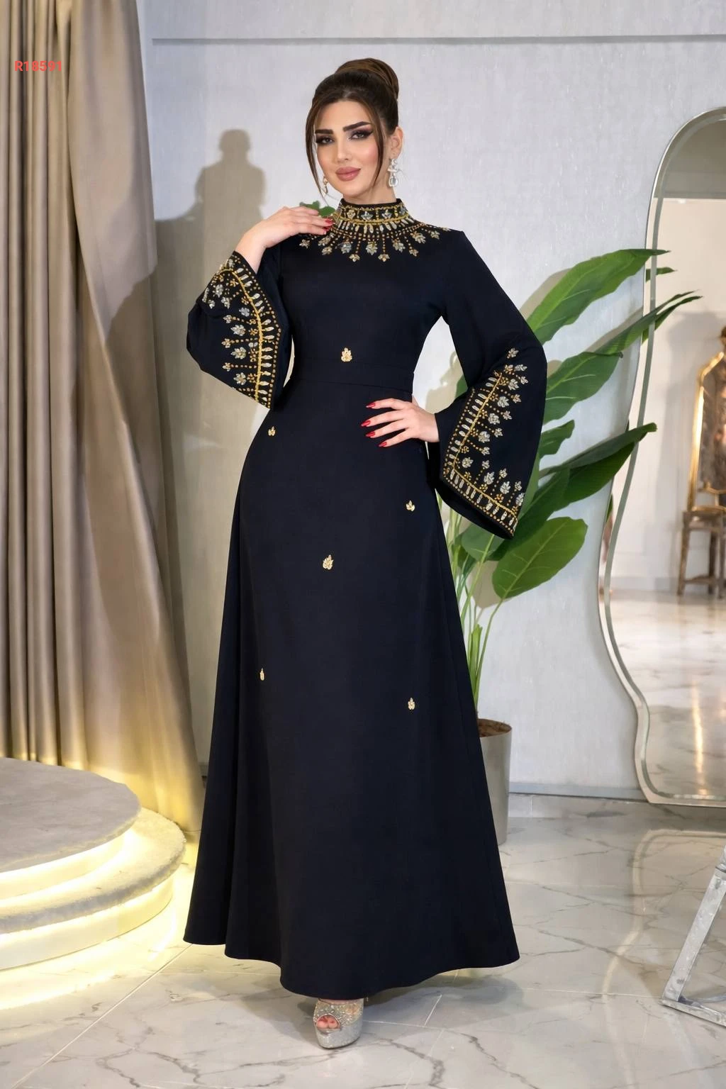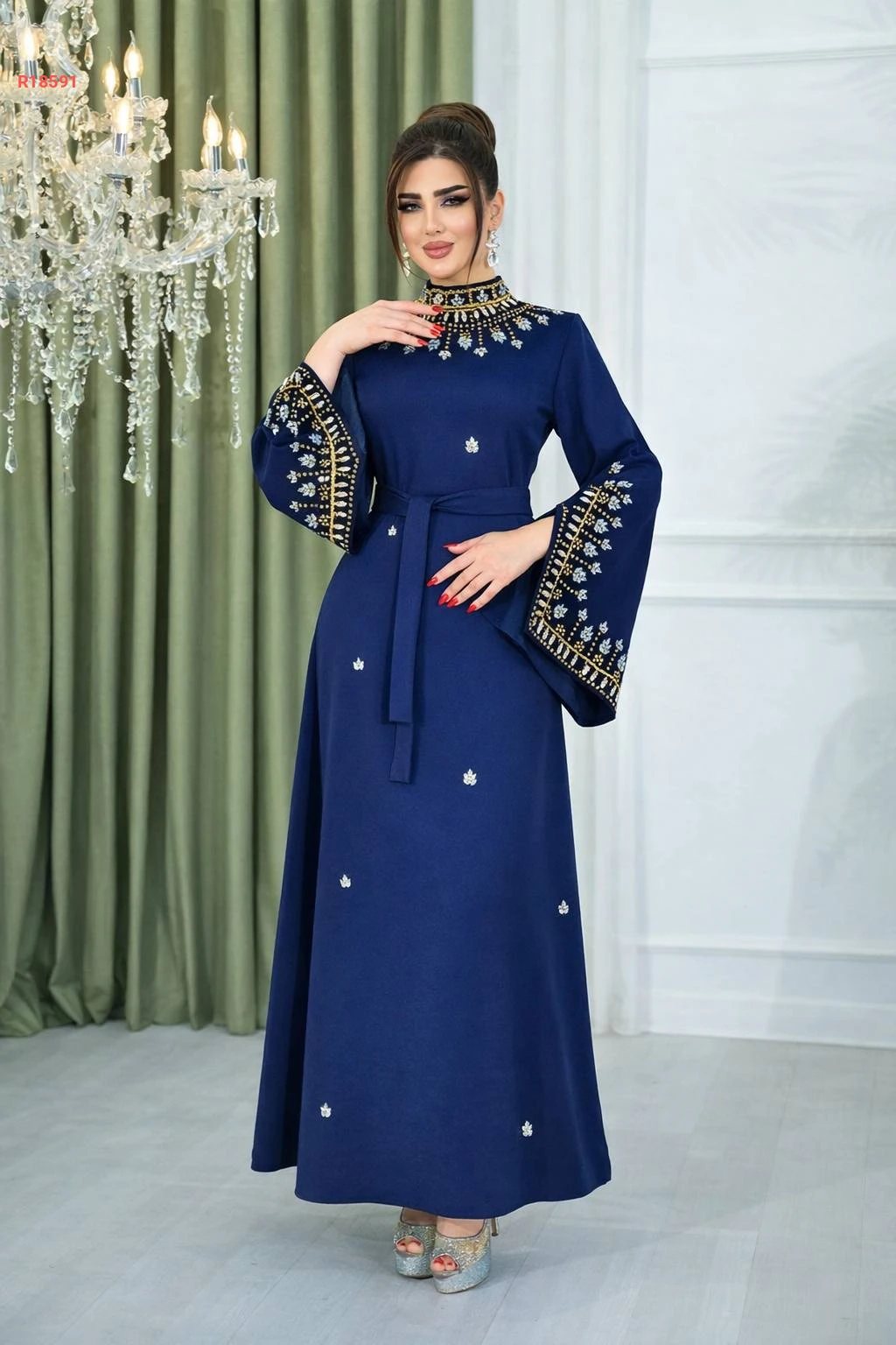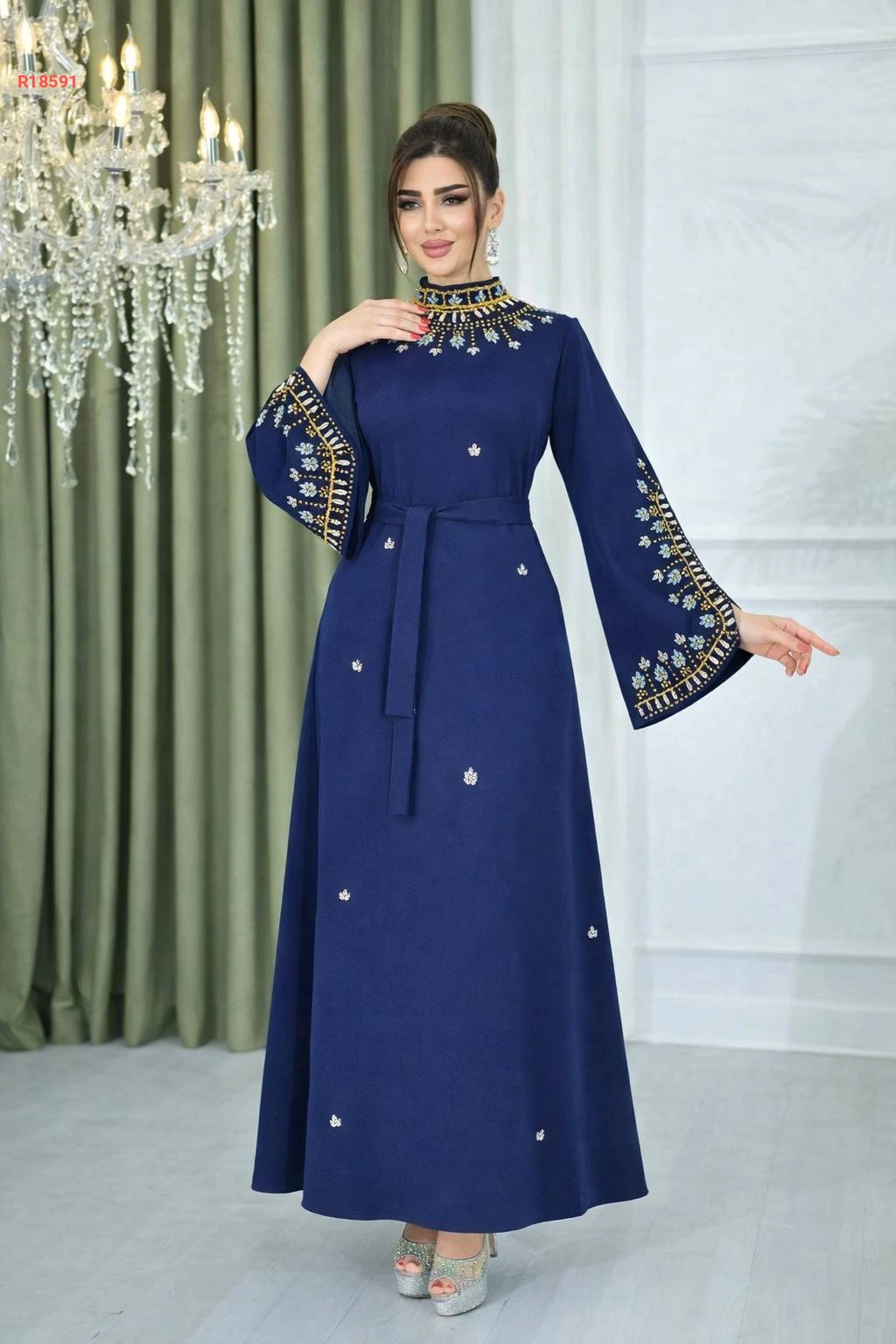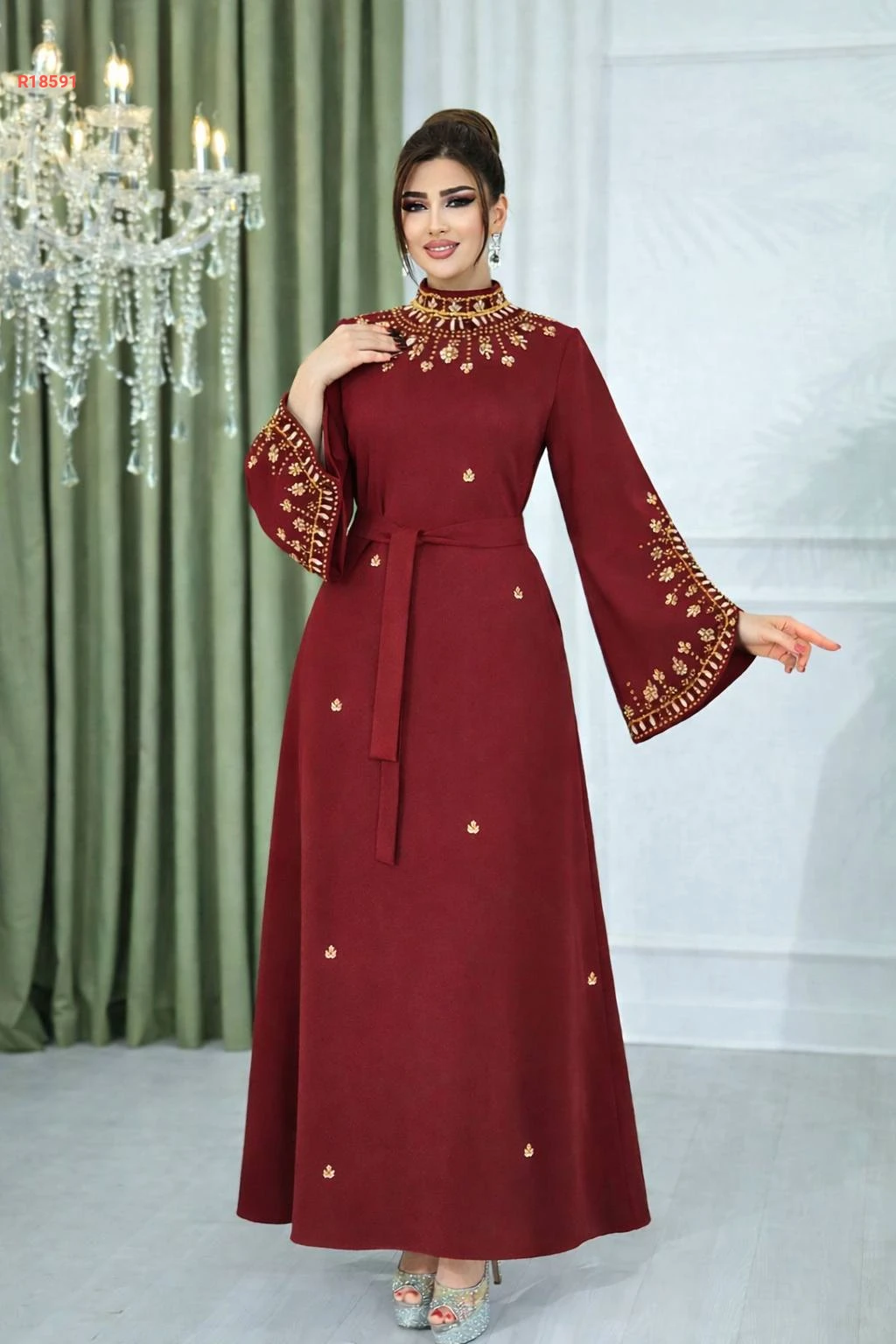 عباية بياقة عالية مرصعة بالكريستال مع أكمام مفتوحة مزينة بالكريستال و حزام