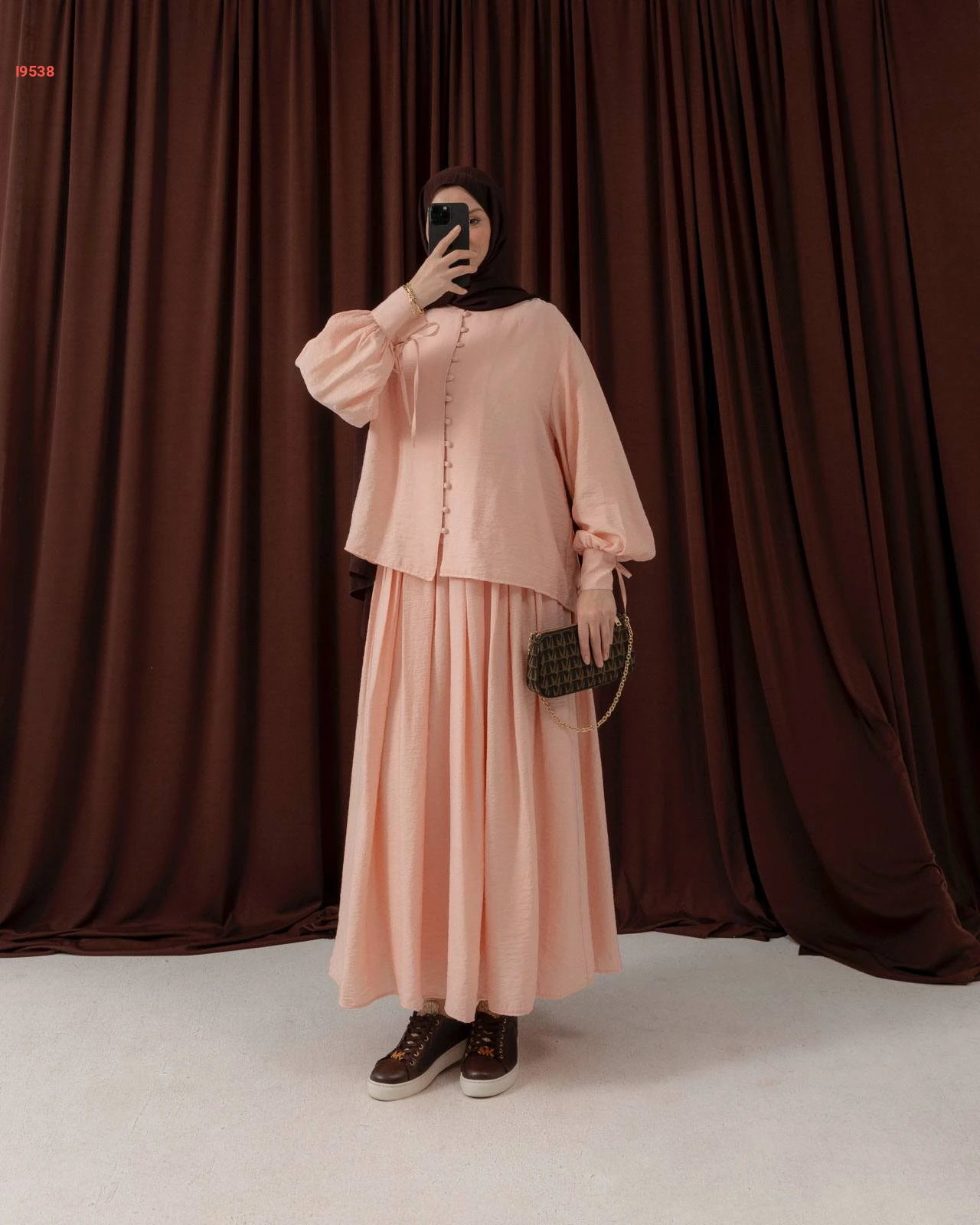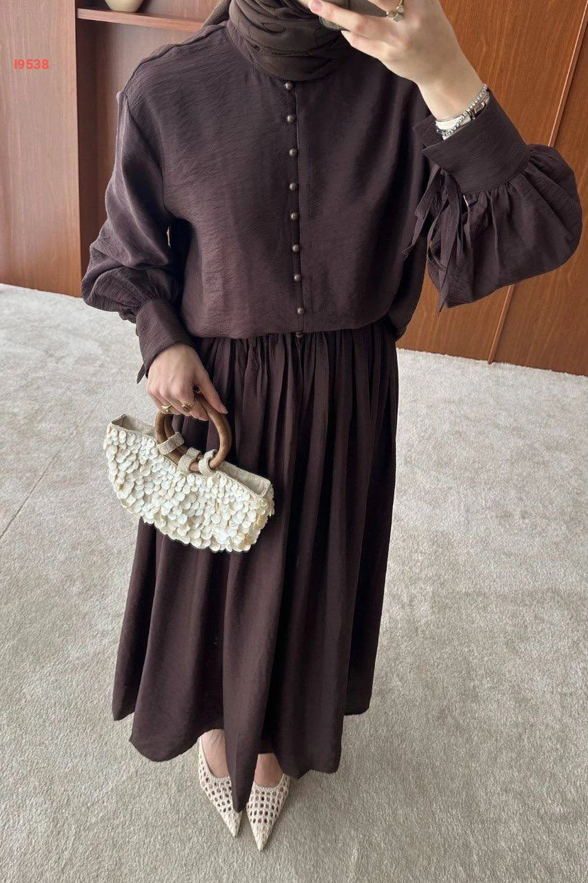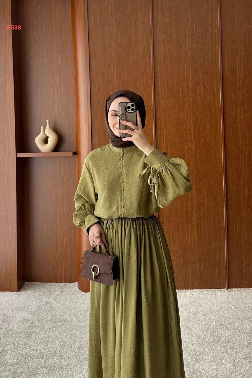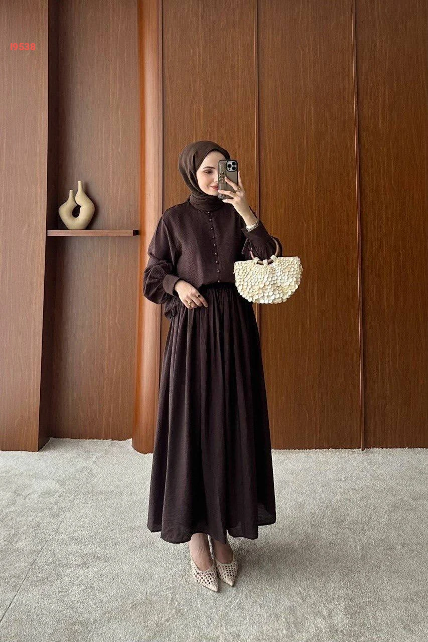 طقم محجبات تنورة طويلة بكسرات مع بلوزة بأزرار