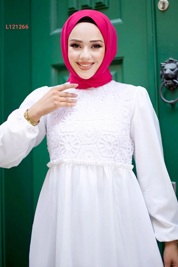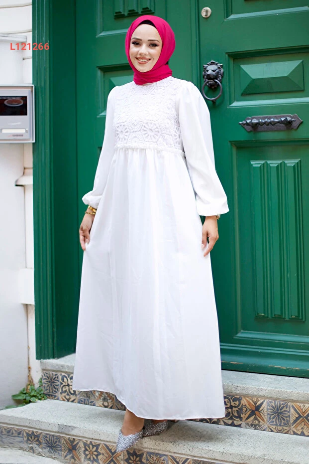 فستان تسريحات طويل بلمسات دانتيل من تسيتور للعالم - أبيض