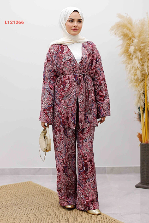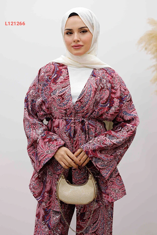 استمتعِ بالأناقة والراحة مع طقم الكيمونو برباط الخصر من "Tesettür Dünyası" بلون البوردو الجذاب. يتميز بتصميمه العصري وقصته الفضفاضة، مما يوفر لك حرية حركة كاملة مع لمسة عصرية تناسب جميع المناسبات. اجعلي إطلالتك مميزة مع هذا الطقم الذي يعكس ذوقك الرفيع في الموضة المحتشمة.