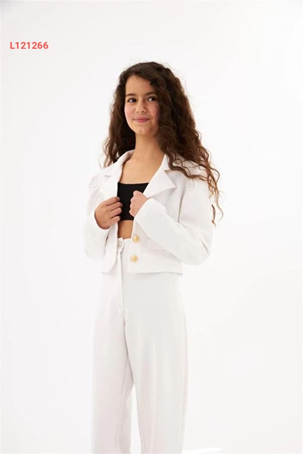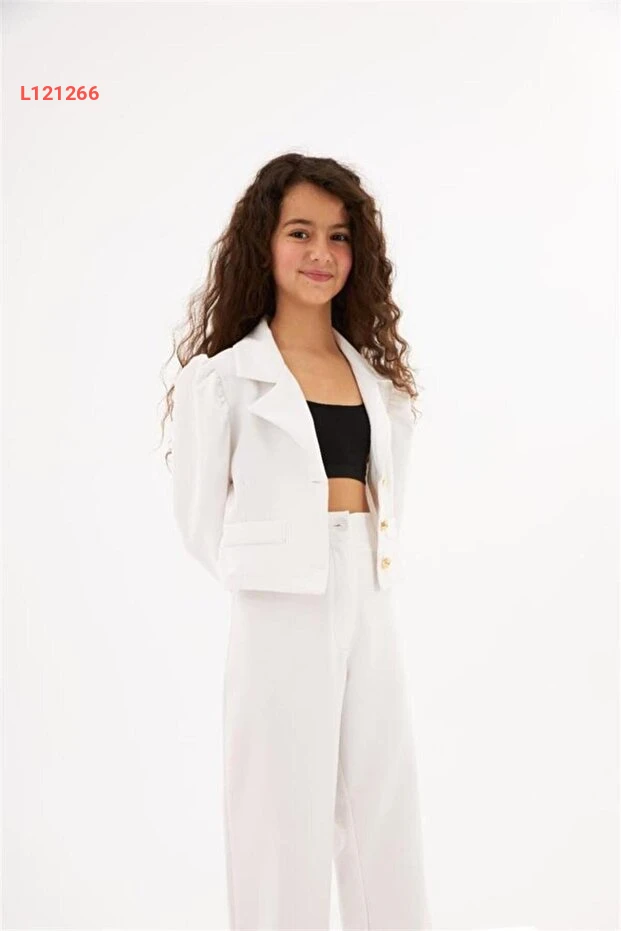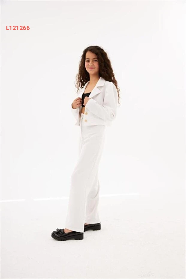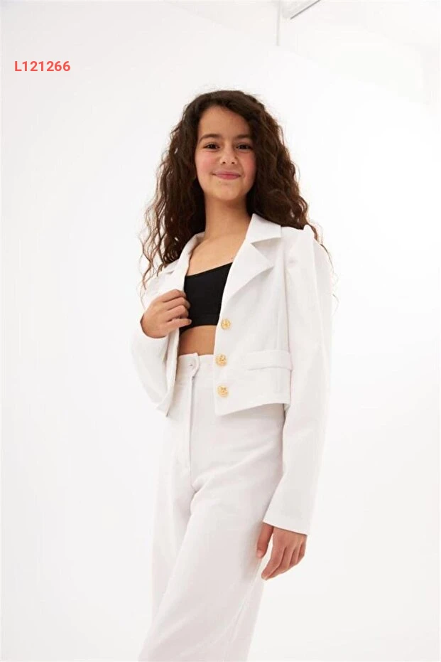 طقم صغيرات مكون من جاكيت قصير بأزرار ذهبية وسروال واسع