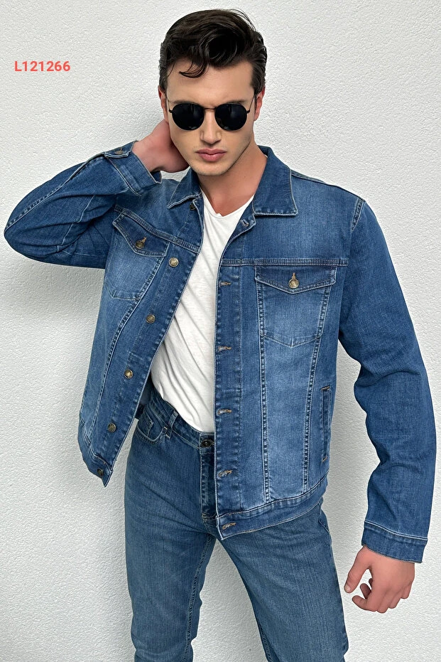 جاكيت جينز رجالي أزرق مع جيوب وقماش مرن Hlthe042101