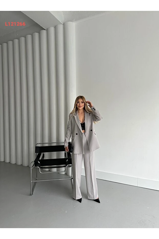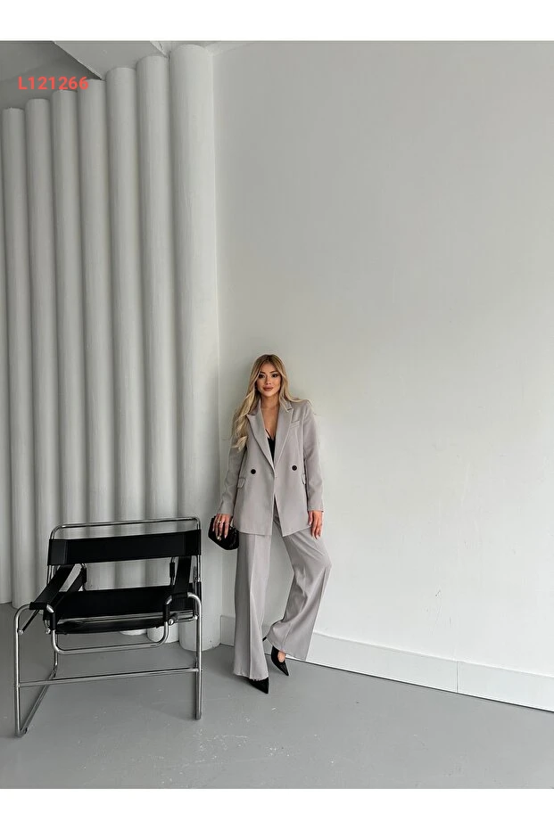 بدلة نسائية مكونة من جاكيت بليزر رمادي فاتح وسروال بالازو
