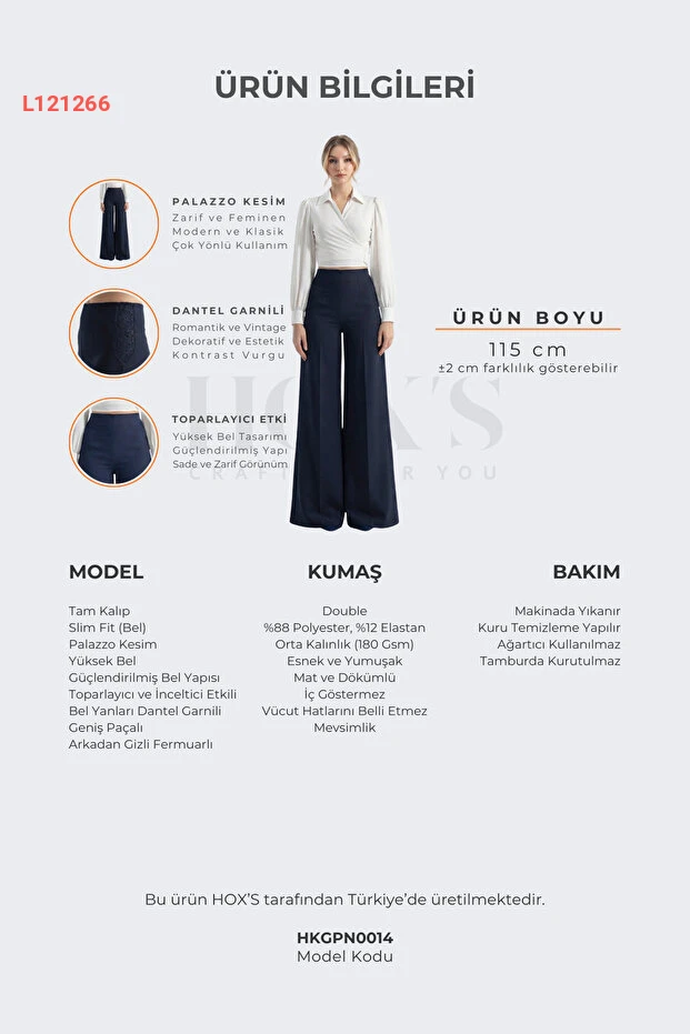 استمتعي بإطلالة أنيقة ومريحة مع بنطلون HOX'S Audrey العالي الخصر والمزين بالدانتيل. يجمع بين الأنوثة والراحة، حيث يوفر تصميمه الواسع حرية الحركة، بينما يضفي الفستان اللمسة الجذابة على أي مجموعة. مثالي للإطلالات اليومية أو المناسبات الخاصة، جلدته البحرية تمنحك تألقًا دائمًا.