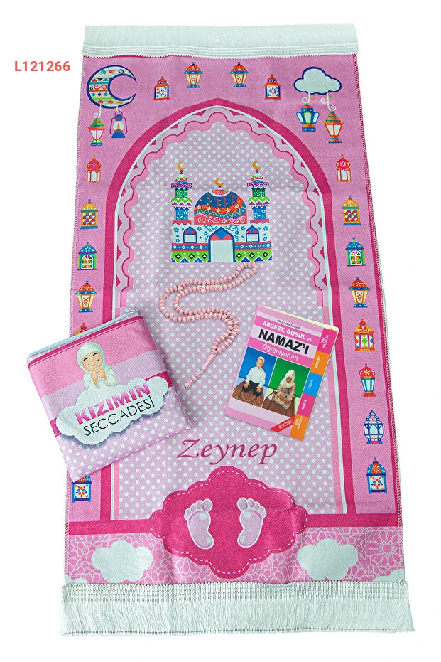 طقم الصلاة للفتيات: عباءة مع حقيبة، سجادة باسم، مسبحة وكتاب تعلّم الصلاة