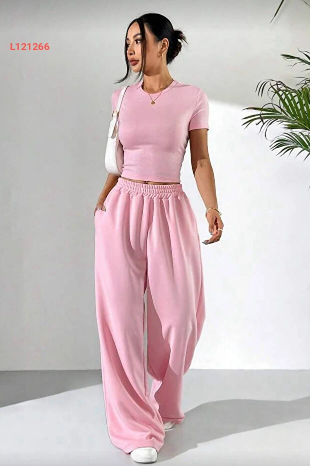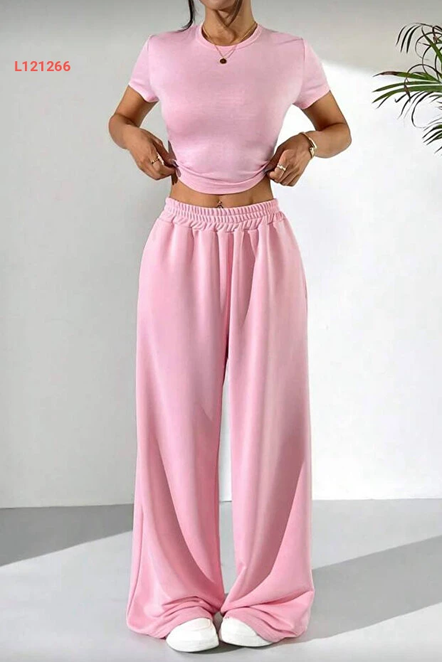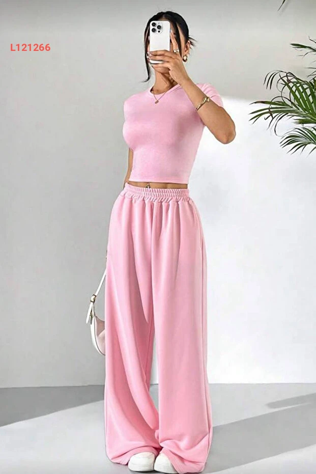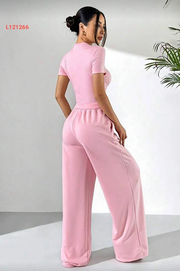 طقم إيلّايدا مكون من بلوزة قصيرة الأكمام وسروال واسع باللون الوردي