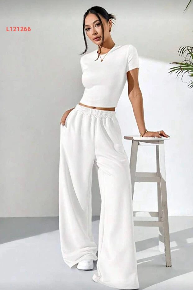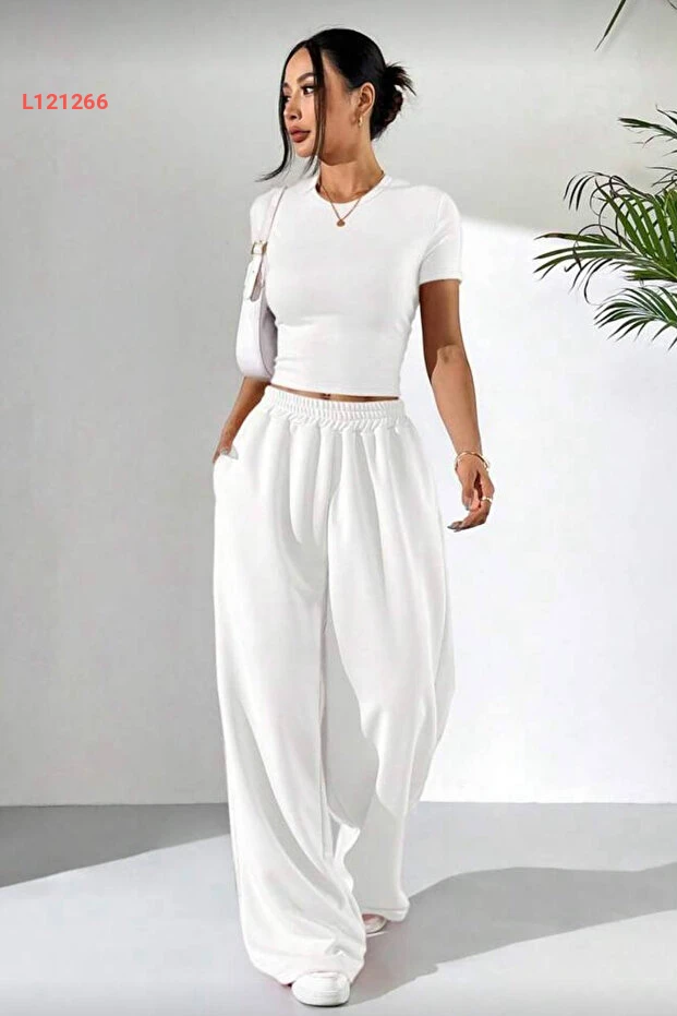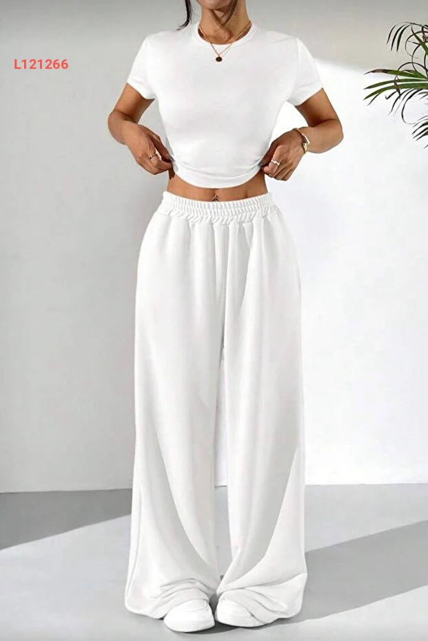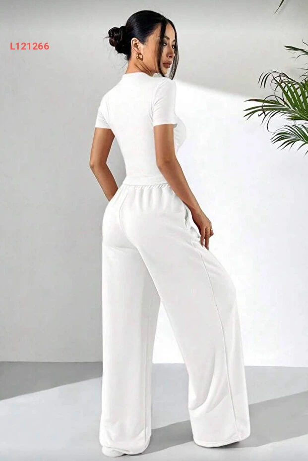 زي كاجوال مكون من بلوزة قصيرة الأكمام وسروال واسع بلون أبيض من إيلاديا