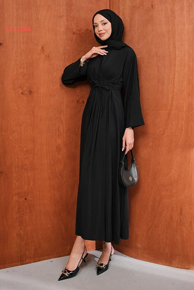 فستان plisé أسود بحزام خصر من إيميج بوتيك